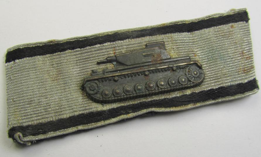 The extraordinary piece on offer here is a very attractive - and truly detailed! - example showing a truly blackened- (ie. silvered and/or non-magnetic!) tank-badge mounted on its original piece of 'woven', silver- ie. black-woven cloth ie. braid. The piece still retains its original (three) prongs and/or metal-based back-plate (which is obscured by a piece of darker-blue-coloured- and/or typical, smooth woolen-based cloth as to be expected). This 'backing' shows some minimal damaged-areas (as can be seen on the pictures). The piece was most certainly once worn and (carefully!) tunic-removed: it still shows some minimal stitching-remains (ie. holes) of having been once tunic-attached. The truly nicely 'blackened'- (ie. 'Buntmetal'-based) tank-badge shows some minimal (rust)staining but was never cleaned nor polished. I am of course aware of the fact that this is (probably) one of the most copied awards of the TR-period: this is naturally a 100% genuine and truly worn example for which I do give a life-time garuantee (as always). I deem that I have priced this neat award accordingly to its desirability and/or unmistaken rarity!