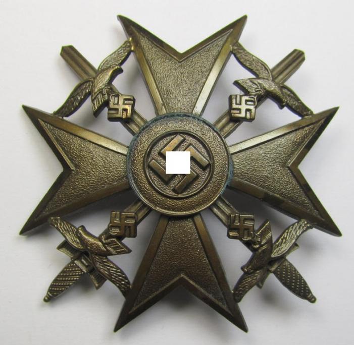 This is a truly very attractive - and actually not that easily encountered! - so-called: 'Spanienkreuz mit Schwerten in Bronze' (or: Spanish cross in bronze with swords) being a neat non-maker-marked example that was produced by the desirable maker: 'Petz u. Lorenz' and that comes in an overall very nice- (and I deem only moderately used ie. worn-), condition. The neat and very detailed award - which comes mounted on its functional (copper-coloured- and typical 'straight-shaped'-) pin and/or typical catch (-set-up) - and is a highly-detailed, bronze-coloured- and/or pronounced (and 'Buntmetall'-based-) specimen (that still retains most of its fairly shiny 'Brennlack'-surface (as can be seen on the pictures). The award truly retains all of its bronze-toned (ie. somewhat darkened-) bronze-toned finish and was only minimally worn (but was certainly never cleaned nor polished). Simply a very attractive example of this fairly scarcely encountered and/or very decorative award that is accordingly priced!