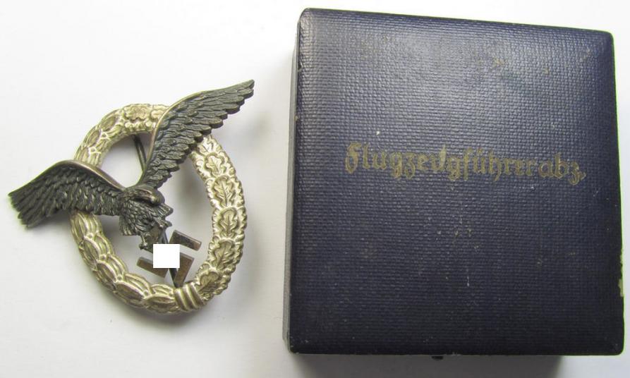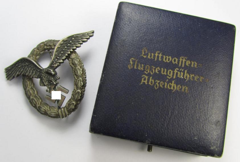The presumably early-war-period- and/or truly very detailed! - war-badge (ie. 'LW-Flugzeugführer-Abzeichen' or: pilots'-war-badge) has I deem only moderately been worn and comes naturally mounted on its fully functional (and fully unaltered) pin- and/or functional catch (ie. catch set-up). The award shows a 'separately'- (and/or very detailed!) bluish-black-coloured eagle-device attached (by means of two firmly attached rivets as is visible on the back). The badge truly retains most of its period finish but does show a minimally tarnished- (ie. typical 'Buntmetall'- ie. 'Tombak'-like-) age-patina as is more often encountered on these high-quality produced war-badges. The neat badge shows a clear makers-mark-signification: 'A' on its back and is thus in all respects an example that was produced by the desirable maker: 'Assmann u. Söhne' based in the town of Lüdenscheid: the award shows naturally all the specific details as known for a genuine badge by this particular maker. The piece is just minimally stained ie. dirty but has I deem never been cleaned: the silverish-coloured wreath and/or somewhat bluish-coloured eagle-device both retain a very nice albeit minimally tarnished appearance (as can be seen on the pictures). The award came stored in its (scarcely seen!) equally early-period- and blue-coloured etui that shows the (fully preserved and/or golden-toned) text: 'Flugzeugführerabz.' on its top (as can be seen on the pictures). This etui is equally nicely preserved and comes in a complete and/or fully functional condition: it just shows some moderate age, wear and/or staining as to be expected (it does show, however, a tiny damaged area on the lower right-side (nothing too shocking though). The set originates from a private household in Germany and was never before in collectors'-hands. These attractive 'Flugzeugführer-Abzeichen'-sets can easily be graded: 'fairly scarce'!