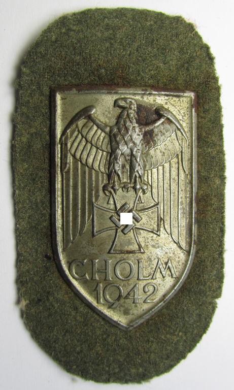 This is a truly very attractive - and/or very detailed! - example of the (with certainty rarely encountered) WH (Heeres ie. Waffen-SS) so-called: 'Cholm' campaign-shield as executed in magnetic, so-called: 'Eisenblech' being a so-called: 'Long M-variant-pattern'-shield that comes in a clearly used- ie. worn- (and/or once tunic-attached-), condition. The silver-greyish-coloured (magnetic and/or minimally converse-shaped-) shield - which is executed in so-called: 'Eisenblech' as to be expected- comes naturally complete with its metal back-plate and naturally also retains its three - originally attached - pins ie. prongs and comes mounted onto its piece of field-grey-coloured and woolen-based backing (that shows a thin-shaped, paper-based protective-backing attached). The shield shows obvious age simply caused by moderate wear and/or decades of storage only: some minimal (rust)staining is visible and/or present, but the shield still retains truly extraordinary detail as to be expected (most ie. all of its period-applied finish is present and or preserved). The shield was of course never cleaned nor polished and comes as found. It was recently found at a private household in Germany and was simply stored as such for decades: it was never before in a collection. It should furthermore be mentioned that these original 'Cholm' campaign-shields are nowadays very hard to come by (these truly worn examples even more so!). Simply a very nice - and naturally 100% original and fully garuanteed! - example of this very collectable and desirable campaign-shield that is nowadays not often offered for sale: I deem that I have priced this attractive example accordingly: I have seen similar examples sell for much more than my asking-price!