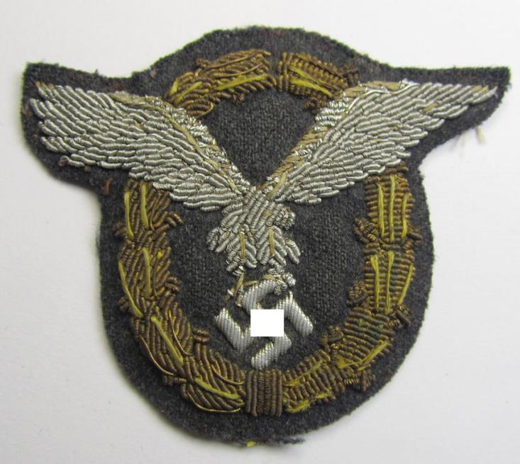 This is a truly very attractive and/or pronounced, hand-embroidered example of an WH (Luftwaffe) so-called: 'Gemeinsames Flugzeugführer- u. Beobachterabzeichen' (aka: 'Doppelabzeichen' or combined pilots- ie. observers-badge) that comes in an overall very nice- (albeit moderately used ie. worn- and/or carefully tunic-removed-), condition. The attractive - and most certainly rarely encountered! - piece has simply extraordinary detail and is wonderfully executed in silver- ie. golden-toned braid: it is a clear example of the great crafmenship employed in the days. The award - which has been executed on fine-structured, LW-officers'-type wool - has a neat and/or slightly tarnished 'age-patina' and is backed with black-coloured linnen (as more often). It originated from a private household in Germany and once belonged to a (regrettably) unidentified pilot and/or presumably trainer. These cloth-based versions were preferred by the NCOs and/or officers 'stationed in the field' for obvious reasons. I should be also noted that these hand-embroidered versions are actually much more rarely encountered than their metal counterparts. Simply a very attractive example of this desirable Luftwaffe-award that is IMO priced according to its wonderful condition: I do not know another such beautiful example for sale!