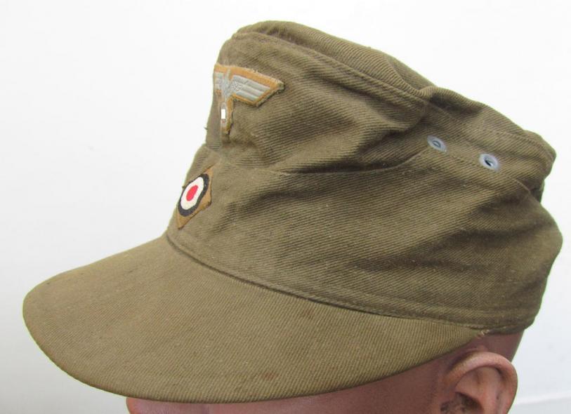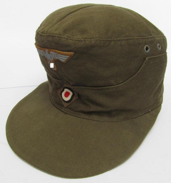 This is a truly very attractive - and only minimally used- ie. worn! - example of a WH (Heeres), 'M41-pattern' (but mid-war-produced!) tropical-issued field-cap (ie.: 'Tropen-Einheitsfeldmütze') being a maker- (ie. 'Mayser-Milz - Lindenberg / 55 / M43'-) marked example that comes in an overall very nice- (I deem only minimally used- and/or worn-), condition. The field-cap - which is executed in 'regular'-type, greenish-tan-coloured linnen - has no damages whatsoever and is nicely maker-marked (with a regrettably only partially readable, blue-coloured ink-stamp that reads: 'Mayser-Milz - Lindenberg / 55 / M43' (as can be seen on the pictures). The mid-war-period field-cap is smaller-sized and measures approximately 55 cms. (which is a size that would normally still fit a smaller-sized mannequins'-head) and shows a tan-coloured- (ie. tropical-issued-) cap-eagle and dito cocarde, period-attached. Both insignia-pieces are executed in the 'BeVo'-weave pattern as to be expected. The cocarde is attached by means of a machine whereas the eagle has been attached by hand (something that is more often observed). The cap - which has its four undamaged- and greyish-silver-coloured- and zinc-based rivets in place - shows a neat bright-red-coloured- and/or linnen-based lining (which is standard for these caps). Moreover, does it show the articfical-leather (ie. also linnen-based-) sweatband installed (which is more often seen on these caps as produced by the: 'Mayser-Milz'-company). The cap shows only minimal staining and storage-age (I deem just caused by minimal wear and years of storage and/or handling). Simply a very attractive - and naturally genuine! - example of a - truly scarcely encountered! - tropical 'M41-pattern' field-cap that will be hard to be upgraded and that is I deem accordingly priced!