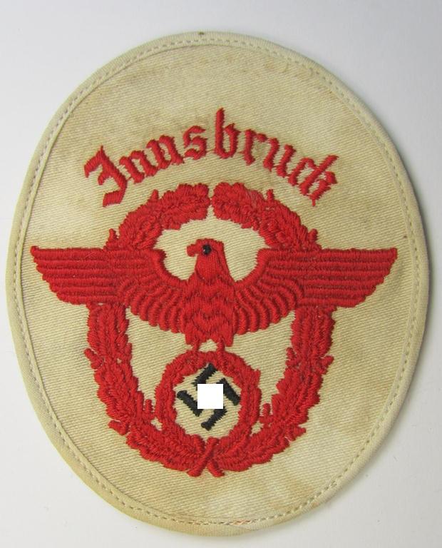 The very attractive - and fairly large-sized arm-badge, sized: 10 x 9 cms. - is executed on the typical, beige-white-coloured summer-type 'Polizei'-type linnen-based cloth (aka 'schillfarbigen Stoff') and is nicely fortified with a (also white-coloured) linnen border as per regulation. The piece - that shows some minimal age, wear and/or staining - comes in an overall nice, albeit I deem minimally used- ie. once tunic-attached, condition. The piece retains, however, great pronounced detail: the used machine-embroidery (done in typical bright-red-coloured linnen) is simply stunning (as can be seen on the pictures). These unusal arm-eagles can also be encountered without having an embroidered town-name above the eagle: this is a 'named' version showing the specific (Austrian) town embroidery entitled: 'Innsbruck'. It should be noted that these neat 'Ärmeladler der Ordnungs- o. Verkehrspolizei in schillfarbigen Stoff' can easily be graded 'very rare' and are hardly ever offered for sale!