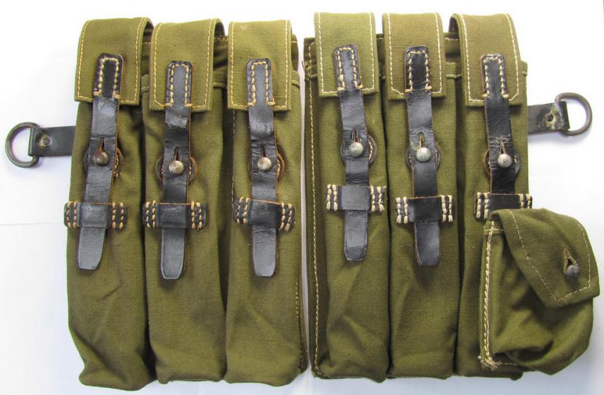 This is a very attractive - and nowadays rarely encountered! - pair of fully matching WH (Heeres ie. Waffen-SS etc.) greenish-coloured- and/or linnen-based so-called: MP38-40-magazine-pouches (ie. 'Magazintaschen für die Maschinenpistole 38 o. 40') which are both clearly maker-marked with the three-digit makers'-designation: 'CLG 43' and bearing a so-called: 'Waffenamt-Abnahme'-stamp, both pouches coming in an overall very nice- (I deem hardlyt used- and/or 'virtually mint'-), condition. Both (fully identically produced-) pouches come in a very nice condition and were hardly- (or even never!) used: they were always together and make a nice and matching pair. Both pouches are nicely marked on their backs with the makers-designation (ie. later-war-period 3-digit code-) that reads: 'CLG' (signifying that they are a 'text-book'-pair as was produced by the company: 'Ernst Melzig Lederwaren' based in the town of Liegnitz), a clear 'Waffenabnahme'-stamp and a date of production: '43' (ie. signifying the year 1943). The blackened- and fine-grain-quality leather of both pouches is excellent and of course fully functional: none of the (sometimes fragile-) straps is broken nor even damaged. All metal parts (rings and snaps are just bit dusty ie. rust-stained as usual but nothing shocking). These original MP-pouches sets are getting harder to find and this set would look superb if re-mounted on any mannequin. Simply a nowadays hardly ever offer for sale set of original and matching MP38-40-pouches that is not inexpensive but fully worth its money!