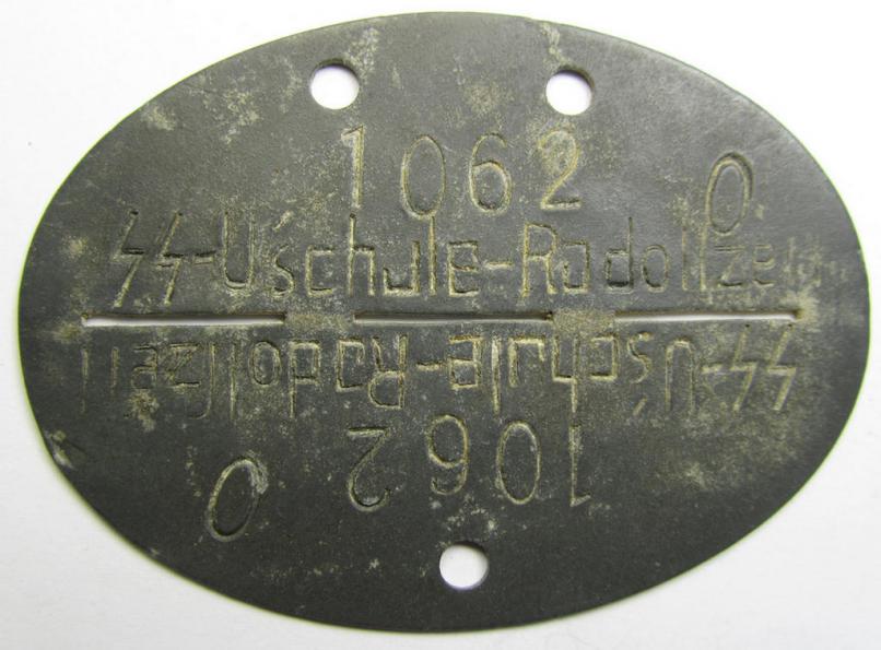 This is a very attractive - and with certainty rarely encountered! - example of a greyish-coloured- and/or: typical zinc-based so-called: 'Waffen-SS'-related ID-disc (ie.: 'Erkennungsmarke') bearing the clearly stamped unit-designation that simply reads: 'SS-Uschule-Radolfzell' (and as such being a disc that was intended for a soldier ie. NCO who served within the: 'SS-Unterführerschule Radolfzell' (or: specific SS-NCO-schooling-institute based in the town of Radolfzell) and that comes in an overall nice- (albeit clearly used ie. worn-), condition. The attractive disc comes in overall nice condition (and is executed in an attractive letter-type!) and shows the clear evidence of having been used ie. worn (it shows some minimally torn-out holes and is still a bit dirty - see pictures). The disc shows the bearers'-blood-group-type (Type '0') stamped on its front as is more often seen on Waffen-SS-related discs and also shows the soldiers ID-number ('1062') and comes as recently uncovered. It was never cleaned nor polished (and it is still a bit stained and/or dirty). Simply an attractive and honest 'Waffen-SS'- (ie. 'SS-Unterführerschule Radolfzell'-) related ID-disc that is priced according to its rarity and desirability!