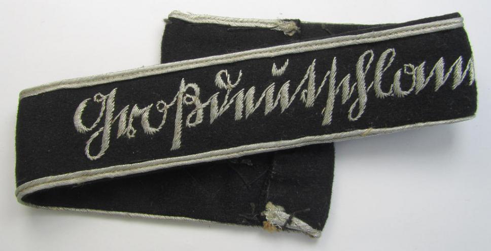 This is a truly very attractive - and actually not that often seen! - non-shortened- (ie. full-length) example of a WH (Heeres) cuff-title ie. armband (ie. 'Ärmelstreifen') entitled: 'Grossdeutschland' being a neatly hand-embroidered example (of I deem the first pattern that was used throughout the war) that was specifically intended for officers'- (ie. evt. NCO-) usage (ie. 'Ärmelstreifen für Offiziere') and that comes in an overall very nice- (ie. most certainly issued- and/or clearly worn- ie. once-tunic-attached-), condition. The cuff-title measures approximately 45 cms. in length and comes as recently found at a private household in Germany. The cuff-title - which does show some minimal age, wear and staining - is executed in the neat (ie. truly 'smooth-type') black-coloured wool and shows the hand-embroidered (ie. 'Schreibschrift'-styled-) text: 'Grossdeutschland' as executed in silverish-coloured braid as to be expected: as such does it deal with a typical example of the first-pattern that was intended for commisioned-staff ie. being an: 'Ausführung für Offiziere'. Both ends are still present (not cut-off) and are neatly folded backwards (as can be seen on the pictures). Simply a very attractive and naturally genuine, period example that is priced according to its rarity and/or desirability!