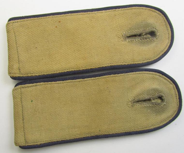 This is a truly very attractive - fully matching and rarely encountered! - pair of early-pattern, WH (Heeres) 'tropical' (ie. truly 'DAK'-related!) enlisted-mens'-type shoulderstraps as piped in the neat darker-blue- (ie. 'blauer'-) coloured branchcolour as was intended for - and with certainty worn by! - a: 'Soldat der Sanitäts-Truppen' (or simple soldier and medical orderly) and that comes in an overall very nice- (albeit moderately used- ie. worn-), condition. The neat shoulderstraps - which measure each approximately 11,5 cms. in length - have the neat darker-blue- (ie. 'blauer'-) coloured and/or desirable 'silk-like'-type piping attached and come on their functional tongues as issued and/or most certainly worn. The straps come in a fully 'text-book' condition and have somewhat faded (ie. sun-bleached), 'greenish-brown'-coloured and/or linnen-based 'upperdeck's. The straps are also 'backed' with brownish-coloured wool, something that is more often encountered with genuine, early-pattern tropical ie. DAK- (or 'Deutsches Afrikakorps'-) related shoulderstraps. The straps are clearly worn (and are as stated above a bit faded ie. slightly stained caused by regular usage) and come in a truly great condition overall. They have never been cleaned and still shows some dirt ie. staining as caused by years of storage and moderate wear. As most certainly known are most DAK-shoulderstraps offered on todays'-market copies: this is naturally a fine and 100% genuine, period pair for which I give a life-time garuantee (as always). Simply a superb - and as most certainly known very rarely encountered! - tropical-pattern, 'Sanitäter'-related EM-type shoulderstrap-pair: one of the nicest pair I had on offer for a long time!