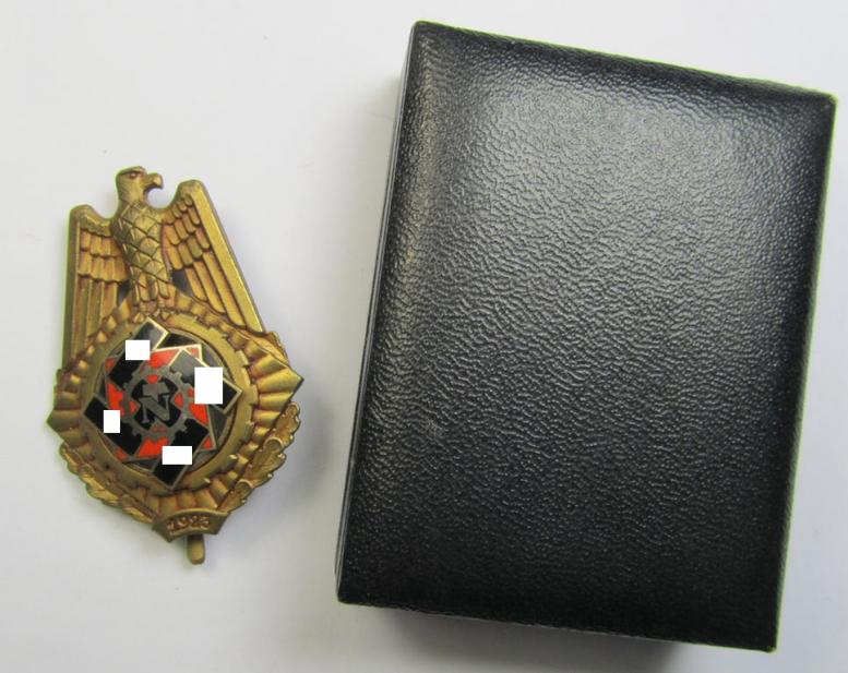 This is a truly superb - and actually rarely encountered! - so-called: 'Technische Nothilfe' (ie. 'TeNo') honorary-award (ie. 'Ehrenzeichen mit Jahreszahl 1923') being a maker- (ie. 'Wilh. Fühner'-) marked and serial-numbered (ie. '1911'-marked-) example that comes stored in its accompanying (and matching!) black-coloured etui as issued and stored for decades. The very attractive and neatly multi-coloured award (that is executed in golden-bronze-toned so-called: 'Buntmetall') has a fully preserved enamelled surface (that is totally void of any enamel-damage or alike as can be seen on the pictures). It comes mounted on its functonal (and totally unaltered!) pin- ie. pin-/catch set-up. The pin shows a clearly present makers'-mark that reads: 'Wilhelm Fühner - Pforzheim' (being IMO the only producer of these rare awards). The back of the badge shows an engraved serial- ie. bearers'-number (that reads: '1911'). The award came stored in its period (black-coloured- and semi-leather-based-) etui that comes in an equally very nicely preserved condition. This etui - sized: 7 x 5,4 x 2 cms. - has a (beige-coloured) interior-section that hardly shows any wear (but that clearly shows an imprint of the award it held for decades). Of additional interest is naturally also the fact that the etui shows a glued-on 'sticker' (ie. 'Vignette') that also shows the serial- ie. bearers'-number (that reads: '1911') - as can be seen on the pictures. Moreover, does it show an additional paper that reads: 'Im Steigenberg' (as can be seen on the pictures). Simply in all respects a very attractive and fully matching TeNo-award-set. It should, moreover, be noted that I have seen these rarely seen: 'Ehrenzeichen mit Jahreszahl 1923'-sets sell for much more than my asking-price!
