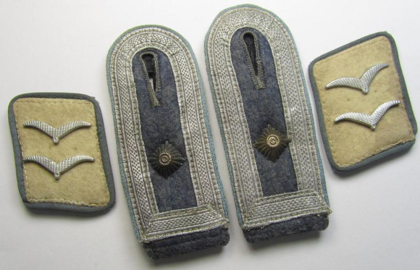 This is a truly very attractive - fully matching and with certainty very rarely encountered! - WH (Luftwaffe) insignia-set comprising of a pair of light-blue- (ie. 'kornblumenblauer'-) piped NCO-type shoulderstraps and dito piped (ie. white-coloured) collar-tabs as was intended for a: 'Feldwebel' (ie. sergeant) and/or: 'Nachschub'- (ie. transport-) NCO who served within the famous 'Hermann Göring Division' and that comes in an overall nice- (albeit clearly used- and moderately worn-), condition. The straps - which come naturally mounted onto their functional tongues - measure approximately 10,5 cms. in length each and come in a wonderful condition overall. They have the neat light-blue- (ie. 'kornblumenblauer'-) coloured (and/or desirable 'silk-like'-type) piping (as can be seen on the pictures) being a branchcolour that officially saw no usage within the 'Deutsche Luftwaffe' but was unofficially used by the (later-war) 'Hermann Göring Division'-ground-troops (esp. in occupied Italy). The pair - which was as stated above only minimally used- and/or worn and that does show some obvious age and/or staining - is presumably a 'privately purchased'-pair: it just shows some minimal wear but is totally void of any damage or alike: it shows the silverish-coloured LW-type NCO-braid and a (matching) pair of silverish-coloured pips period-attached (as can be seen on the pictures). The (typical) woolen-based pair of white-coloured collar-tabs show the same light-blue- (ie. 'kornblumenblauer'-) coloured (and/or desirable 'silk-like'-type) piping attached and have the (typical) 'buckram-based backing' attached. Moreover, do they show each a pair of aluminium-based gulls (ie. 'Schwingen') attached. All four insignia-pieces were moderately used and clearly tunic-removed: they show some age, wear and/or minimal staining. I would not be surprised when this set was worn on a (very rarely seen!) LW-type 'wrap-around'-tunic. This neat insignia-set was never part of a collection before and came as such from a private household in Germany. Simply a truly attractive 'Hermann Göring-Division'-related, NCO-type 'LW-Nachschub'-insignia-set that is priced according to its comparative rarity and/or desirability!
