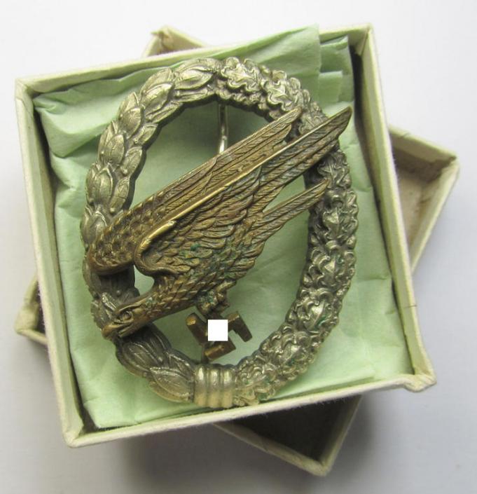 The truly attractive - and actually not that often seen! - Luftwaffe-war-badge truly retains most of its period-applied finish but does show a minimally tarnished- (ie. typical 'Tombak'- (ie. 'Buntmetall'-) like-) age-patina as is more often encountered on these Luftwaffe-war-badges by the 'Imme & Sohn'-company based in the town of Berlin. The badge shows a clear makers'-mark-signification (ie. 'Imme & Sohn - Berlin') and is in all respects thus an example that can be attributed to this desirable maker: the award shows naturally all the specific details as known for a genuine badge by this particular maker. The award shows a 'separately'- (and/or very detailed!) bright-golden-toned eagle-device attached (by means of two firmly attached- (and unaltered!) rivets (as is visible on the back). It retains a functional pin (-set-up) and has a functional and non-repaired catch (as can be seen on the pictures). The piece clearly used- and worn and is a bit stained ie. dirty but has - I deem - never been cleaned: the silver-coloured wreath and/or golden-coloured eagle-device both retain a very nice albeit minimally tarnished appearance (as can be seen on the pictures). It should, moreover, be noted that these attractive 'Fallschirmschützen-Abzeichen' by the 'Imme & Sohn'-company can easily be graded: 'scarce' and are not that easily encountered. The piece shows a (hard to decypher) engraved text (ie. name of the bearer) on its back (as can be noticed on the pictures) and came packed in a (period?) white-coloured- and carton-box as stored for decades. The neat piece originates from a private household in Germany and was never before in collectors'-hands. I deem that I have priced this attractive - and truly worn! - piece according to its compararive rarity and/or desirability!