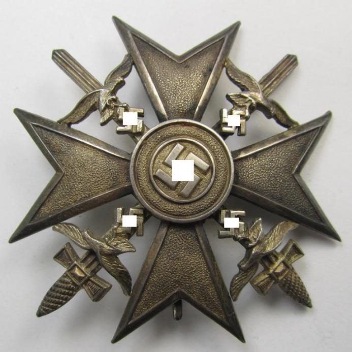 This is a truly very attractive - and with certainty rarely encountered! - so-called: 'Spanienkreuz mit Schwerten in Silber' (or: Spanish cross in silver with swords) being a clearly maker- (ie. 'CEJ'-) marked and high-quality-produced(!) example that was produced by the desirable maker (ie. 'Hersteller') 'C.E. Juncker' based in Berlin and that comes in an overall very nice- (albeit moderately used- and/or worn-), condition. The very attractive and truly very detailed award - which comes mounted on its functional (silver-coloured- and typical 'flute-shaped'-) pin and/or (also typical) catch (-set-up) - is a highly-detailed, silver-coloured- and/or pronounced (and genuine silver-based-) specimen: next to the abovementioned 'CEJ'-marking does the piece also show a so-called: '900'-silver content-marking (as can be seen on the pictures). The award truly retains all of its silver-toned (ie. somewhat darkened- ie. tarnished) silver-toned finish and was (I deem) only moderately worn (the piece was most certainly never cleaned nor polished). Of interest is, moreover, that the four tiny (and very detailed!) eagle-devices are separately inserted into the cross (as to be expected). The piece originates from a private household in Germany and was never before in collectors'-hands: it was found together with the 5-pieced 'Ordenspange'-set I offer under number 50265: both items belonged to the same Luftwaffe-member and Spanish Civil War-veteran. Simply a very attractive example of this rarely encountered and/or very decorative award: I deem that I have priced it according to its unmistaken desirability and rarity!