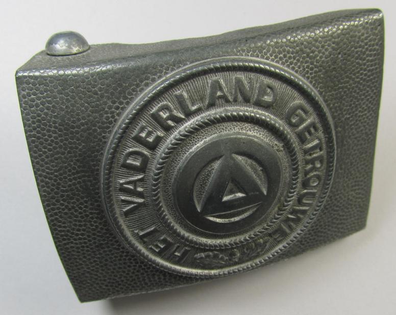 The truly very attractive - and originally silverish-toned- and/or typical steel-based - belt-buckle (ie. 'Koppelschloss für Unterführer u. Mannschaften des VNV') comes in wonderful and only minimally used- and/or worn condition: it truly retains most of its typical, period-sprayed- and/or: silverish-coloured paint (just some minimal usage-marks can be noticed as can be seen on the pictures). The piece - that shows the 'VNV'-logo (a triangle in a circle) surrounded by the (Dutch- ie. Flemish) text: 'Het Vaderland Getrouwe' (loyal to the fatherland) shows, moreover, some minimal dirt and/or evident staining but has, nevertheless, maintained a truly very detailed and/or pronounced appearance. The buckle is a typical, non-maker-marked, so-called: Belgian-produced example that can easily be recognized by its typical 'belt-catch' (as can be seen on the pictures). The Flemish political party 'VNV'- (or: 'Vlaams Nationaal Verbond'-) being the Dutch wording for 'Flemish National Union') was a Belgian nationalist political party active in Belgium between 1933 and 1945. It became the leading force of political collaboration in Flanders during the German occupation of Belgium during World War II. Authoritarian by inclination, the party advocated the creation of a 'Greater Netherlands' (aka: 'Dietsland') combining both Flanders and the Netherlands. As most certainly known are these original, VNV-buckles extremely rarely found: I deem that less than a dozen are known to be in collections to date. The piece orginates from an older belt-buckle-collection that was compiled over many years and that I acquired for the web-site. I deem that I have priced this superb, Belgian-related, collaborationist 'VNV'-belt-buckle according to its unmistaken rarity and/or obvious desirabilty!