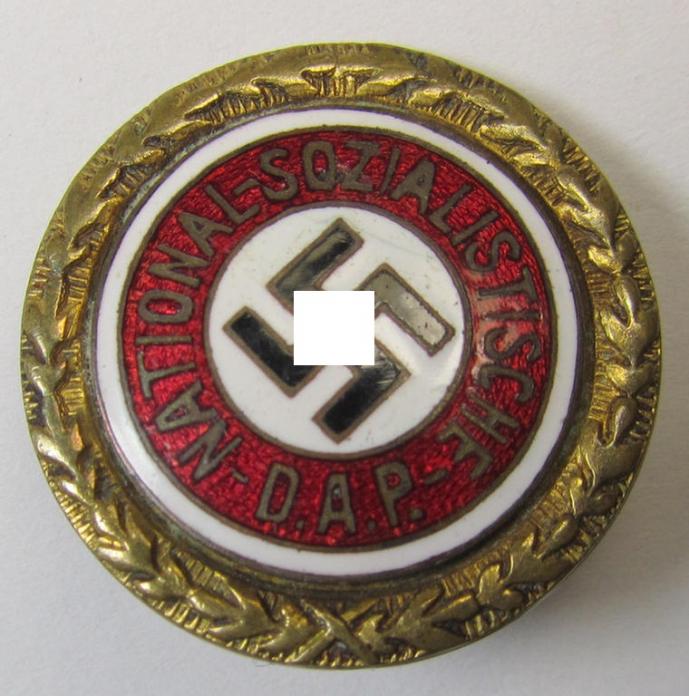 This is a truly attractive - and with certainty rarely encountered! - example of a: 'Goldenes Ehrenzeichen der N.S.D.A.P.' (or: 'kleines Partei-Abzeichen für den Zivilanzug') being a smaller-sized- (and neatly maker- ie. 'Jos. Fuess'-marked-) 'variant' showing the unique bearers'-number: '85072' and that comes in an overall very nice- (albeit moderately used- ie. worn- but totally undamaged), condition. The badge - which has an approximate diameter of 24 mm. as always - has a very attractive age-patina and was never cleaned nor polished. The neat smaller-sized badge is showing some regular wear but has truly no enamel damage whatsoever (it is just a tiny bit dirty ie. tarnished as more often encountered) and shows a fully preserved and nicely bright-golden-toned finish (as can be seen on the pictures. This example - which has a bright-red- (and black- and white-) coloured enamelled area - comes mounted onto its regular 'pin/catch'-set-up (which is naturally still fully functional and present and that shows the makers'-designation as mentioned above). The piece comes with some (post-war ie. from original files copied) paperwork wherein it its clearly stated that this badge belonged to the 'Parteimitglied' Heinrich Lachner born 8 June 1893 who was a member within the 'Ortsgruppe Ettlingen' in the 'Gau Baden' and who joined the N.S.D.A.P. as early as 30 July 1927. Simply an attractive and original, smaller-sized so-called: 'Goldenes Ehrenzeichen der N.S.D.A.P.' that is priced according to its comparative rarity and/or desirability!