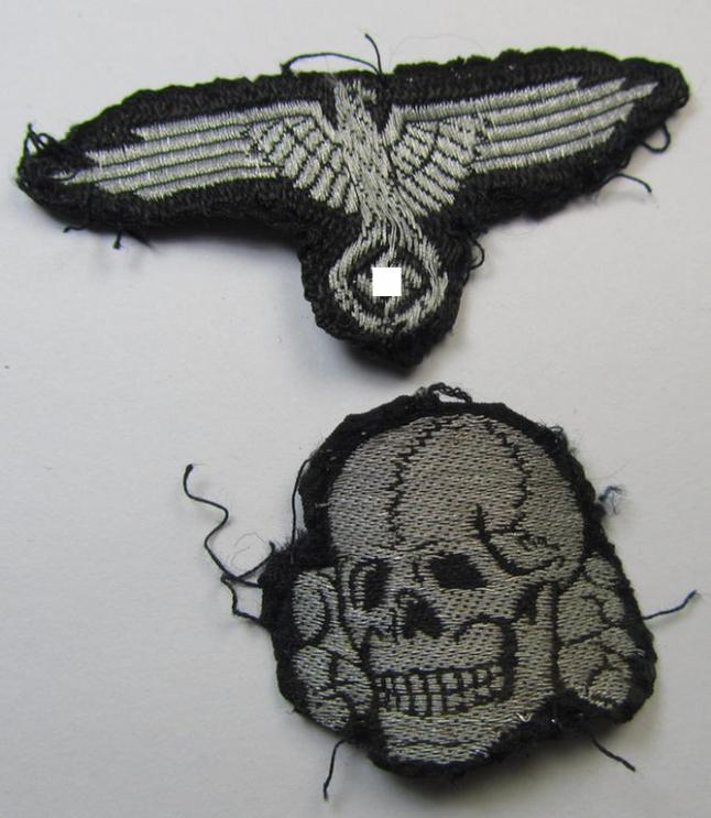 The truly very attractive - fully matching and very rarely encountered! - Waffen-SS officers'-pattern, 'BeVo'-woven-style cap-eagle- and skull-set (ie. 'Effektensatz für Führer der Waffen-SS') that comes in a clearly used- (ie. obviously, cap-removed-), condition. The 'BeVo'-woven-style insignia-set on offer here is neatly executed in so-called: 'BeVo'-weave, so-called: 'flatwire'-weave-pattern (and is executed in bright silver-coloured thread on a black-coloured- and/or: linnen-based background as to be expected). As such, it can naturally easily be re-mounted on a Waffen-SS officers'-pattern side-cap (ie. 'Schiffchen') (or even a so-called: 'M43'-type-cap ie. 'Einheitsfeldmütze'). As stated above, come both insignia-pieces in a clearly confectioned- (ie. clearly once cap-attached-) condition: both insiginia-pieces are nicely period-folded and still show some of the stitching-remains with which they were once cap-attached (as can be seen on the pictures). Of additional interest is, moreover, the fact that the cap-skull is of the typical larger-sized format (as can be seen on the pictures). The (matching!) set came together and will also be sold as a set: I will not sell the skull separately. Both pieces are a tiny bit stained (simply caused by years of storage and or moderate wear) and were both period 'folded' (and stored as such for decades). It should be noted that these original Waffen-SS-related officers'-pattern insignia-sets are almost impossible to find and can nowadays easily be graded 'very rare'. I deem that this truly used- and/or worn officers'-pattern-insignia-set is accordingly priced!