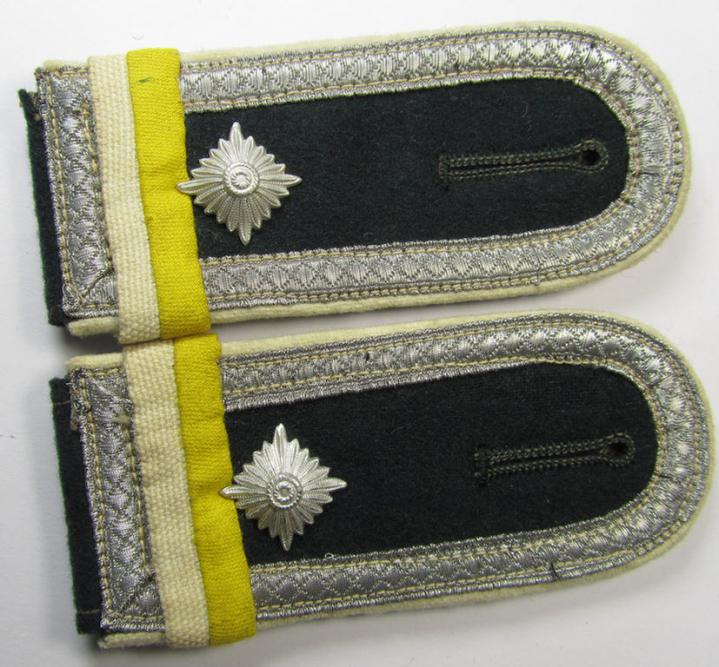 This is a very attractive - fully matching and actually rarely encountered! - pair of WH (Heeres), so-called: 'M36'-pattern- (rounded-style) NCO-type shoulderstraps as piped in the neat white- (ie. 'weisser'-) coloured branchcolour and having a pair of rarely seen white-and-yellow-coloured so-called: regimental-indicator slip-ons (ie. 'Laschen') period-attached, as was intended for a: 'Feldwebel eines Infanterie-Regiments' (or: sergeant who served within an infantry unit ie. regiment) and that comes in an overall nice- (albeit moderately used- and/or worn-), condition. The neat shoulderstraps - which measure approximately 11,3 cms. in length - come naturally mounted on their original tongues (see pictures). The straps were IMO moderately used ie. worn: they come as found and/or stored for decades and are a tiny bit dirty and/or stained and show the obvious signs of having been moderately worn. The shoulderstraps - which show the neat and desirable, white- (ie. 'weisser'-) coloured and/or woolen-type piping - have the silverish-coloured- and/or standard-pattern NCO-braid (and a single pip each) attached denoting that the NCO who wore this pair held the rank of: 'Feldwebel' (ie. sergeant). Simply an attractive pair of an early- (ie. pre-) war-period so-called: 'M36-pattern'-shoulderstraps as was intended for - and worn by! - a: 'Feldwebel eines Infanterie-Regiments': I deem that this pair is accordingly priced (especially taken into account the presence of the rarely seen so-called: 'regimental-indicator' 'Laschen'!