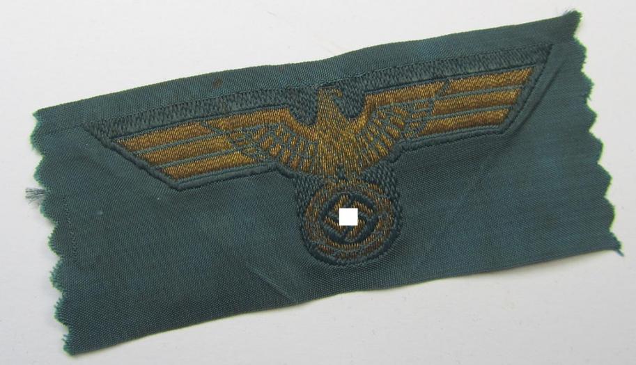 This is a truly very attractive - and with certainty very rarely encountered! - WH (Heeres), general-officers'-pattern cap-eagle (ie. 'Schiffchenadler für Generale des Heeres') as was executed in golden-coloured, so-called: 'BeVo-flatwire-weave'-pattern on a darker-green-coloured- and linnen-based background and that comes in an overall very nice (ie. virtually mint- ie. unissued-), condition. The piece is neatly executed and was never confectioned nor cap-attached: its comes 'as straightly cut-of the role' and simply cannot be upgraded. It is executed in golden-coloured 'braid' on a darker-green-coloured (and/or also linnen-based-) background (as can be seen on the pictures). These very attractive cap-eagles saw usage on the general-officers'-pattern, WH-'Knautschmützen' ie. 'Alter-art' visor-caps (or: 'Schirmmützen für Generale des Heeres') although the eagles could also be worn on the 'high-quality', officers'-type side-caps (ie. 'Schiffchen für Generale des Heeres'). In any case is this a nice occasion to aquire a very attractive - and very rarely encountered! - WH (Heeres), general-officers'-pattern cap-eagle (ie. 'Schiffchenadler für Generale des Heeres'): I deem that I have priced this superb example according to its unmistaken rarity and/or desirability!