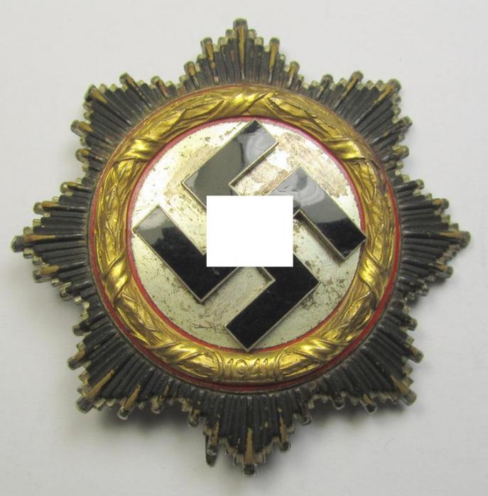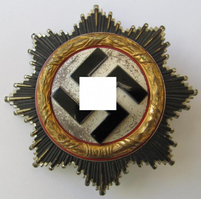 This is a truly very attractive - albeit clearly issued and/or moderately used - example of a neatly maker- (ie. '20'-marked-) example of WH (Heeres, Waffen-SS, Luftwaffe etc.) 'Deutsches Kreuz im Gold' (or DKiG ie. German Cross in gold) being a (light-weight) piece that was with certainty produced by the: 'C.F. Zimmermann'-company as based in the town of Pforzheim and that comes in an overall very nice- (albeit used- ie. moderately worn-), condition. The piece has a (fully preserved!) enamelled surface (ie. swastika-area) that just shows some minimal wear and/or minimal scratches (something that can be seen on the pictures). The piece shows some moderate age ie. wear but is totally void of any (real) damage. It shows a bright-golden-toned (ie. metal-based) wreath as to be expected. The award shows an attractive silver-coloured age-patina (it has not been cleaned and is still a bit dirty ie. stained) and retains all its four (fully unaltered) rivets in place. The award shows a clearly present maker-designation '20' in place (present on the back of the flute-shaped pin) and comes as expected on its fully functional (and equally unaltered!) catch- ie. pin-set-up in place. Simply a very attractive - and naturally 100% genuine! - example of a high-class award - only second in grade to a Knights Cross or 'Ritterkreuz des Eisernen Kreuzes'! - that IMO is accordingly priced. Simply a stunning light-weight 'Zimmermann'-example that is actually hard to be upgraded!