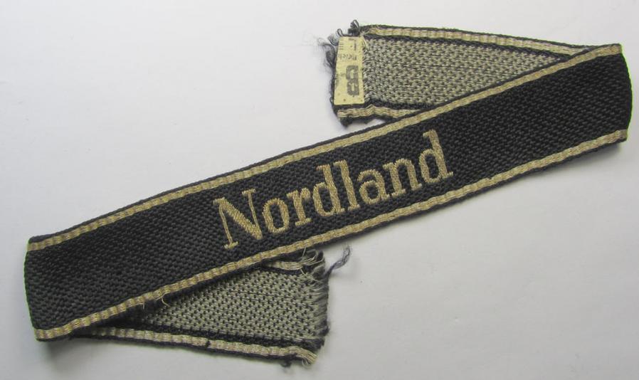 This is a truly very attractive - and naturally 100% original and with certainty very rarely encountered - Waffen-SS, officers'-pattern cuff-title (ie. 'Ärmelstreifen für Offiziere') as was executed in so-called: 'flat-wire, BeVo-weave'-pattern, as was intended for officers serving within the: '11. SS-Freiwilligen-Panzergrenadier-Division' “Nordland” and that comes in an overall very nice- (ie. clearly used- and carefully tunic-removed-), condition. The cuff-title has been period-shortened and measures approx. 37 cms. in length: it shows the typical 'salt and pepper'-reverse and shows all details of an original, period specimen. This band was with certainty produced by the 'Bandfabrik Ewald Vorsteher' (ie. 'BeVo') based in the town of Wuppertal (something that is 'standard' with flat-wire-woven examples). This cuff-title is a 100% text-book - and as stated above - original example as executed in the Roman-style script that originates from a US-veteran who 'liberated' this piece in 1945. The piece shows some truly minimal staining and age and was as stated above once tunic-attached: it shows some age and or staining and shows a tiny piece of the period-attached 'RzM'-etiket (as can be seen on the pictures). Simply a great opportunity to acquire a very attractive - and rarely encountered! - Waffen-SS, officers'-pattern and 'BeVo-Metallfaden-gewebtes'-type cuff-title for a competitive price!