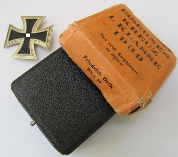 This is a truly very attractive - and/or hardly worn- ie. never used- example of an: 'Eisernes Kreuz 1. Klasse' (or: Iron Cross 1st class) being an attractive and neatly maker- (ie. '15'-) marked example as was produced by the desirable Austrian maker (ie. 'Hersteller'): 'Friedrich Orth' and that comes stored in its original, simulated leather-based etui and still retaining its (rarely seen!) 'Überkarton' as issued and/or recently found and that comes in an overall very nice- (ie. hardly- or even never worn-), condition. The non-magnetic cross has a superb age-patina and retains truly great detail: the black-coloured core shows no rust nor damage whatsoever: the (somewhat 'matted') black painted core is truly fully preserved without showing any (paint) damage. The piece retains, moreover, most of its so-called: 'hochpolierte Kanten' (as can be seen on the pictures). The (flute-shaped) pin and catch (ie. set-up) are naturally unaltered and/or fully functional. The etui comes also in a very fine and complete condition: the silver-rimmed cross that figures on the etui's-top is in very nice and totally undamaged condition whereas the off-white- (ie. yellowish-coloured-) and/or felt-like interior is also present and in place (it does show some minimal age and/or staining). The cross - which is a non-vaulted example as more often - is as stated above - a neatly maker- (ie. '15'-) marked example that was produced by the desirable Austrian maker 'Friedrich Orth' based in the town of Wien (ie. Vienna). Of great interest is moreover the fact that this example came with its bright orange-coloured- (and rarely seen!) 'Überkarton' (which shows some regular age and/or staining and that misses two of its inner-flaps). It also does show some pencilled (albeit hard to decyher) text that reads: 'Obergefr…..' (or alike). Simply a very attractive - and fully matching! - IC1-set that was never before in a collection and that is priced according to its rarity and/or desirability!