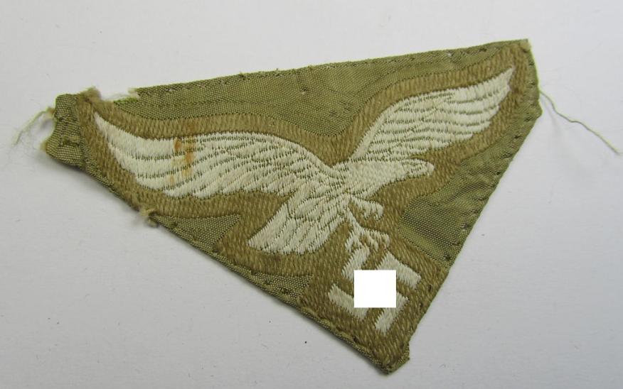 This is possibly one of the rarest WH (Luftwaffe) 'BeVo'-woven cap-eagles to encounter on todays'-market: a truly attractive (and cap-removed!) example of the WH (Luftwaffe) neatly 'BeVo'-woven- and/or tropical-issued cap-eagle as was specifically designed for usage on the tropical LW so-called: 'Hermann Meyer'-field-caps. The piece on offer here clearly issued and carefully cap-removed (it was carefully pre-folded but not 'trimmed' and is just a bit wrinkled and minimally stained). This is only the third such rare piece I ever had on offer: I deem that its high asking-price is accordingly for this extremely rarely found cap-badge. Caps without insginia are sometimes offered for sale: the specific inisignia are as far as I know almost never offered for sale. Simply a superb and very desirable LW-cap-eagle!