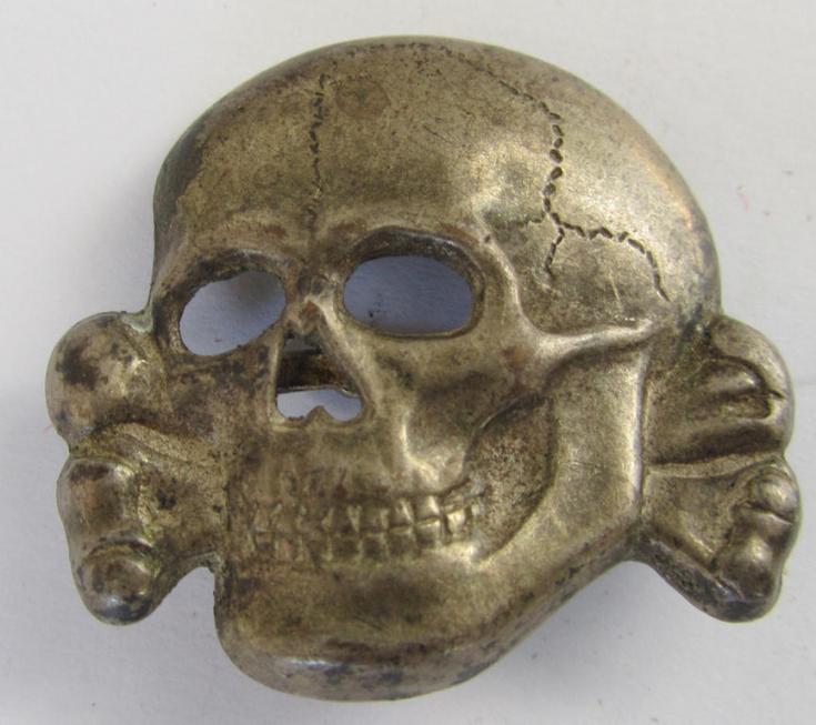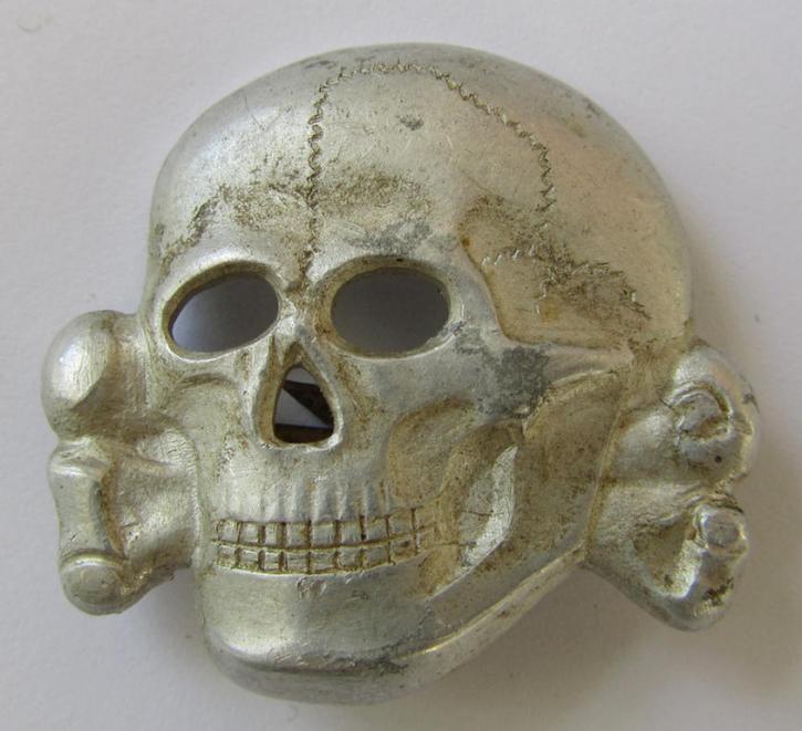 This is a very attractive - and extremely rarely encountered! - early-period-, 'Waffen-SS' visor-cap skull (ie. 'Totenkopf für Schirmmütze') being a very detailed- and/or maker- (ie. 'RzM 254/42'-) marked example as was executed in silver-coloured metal (ie. 'Buntmetall') and that comes in an overall nice- (albeit moderately used- and/or worn-), condition. This example is neatly maker-marked: 'RzM 254/42' on its back and is thus a (very early!) piece that was produced by the company: 'Deschler u. Söhne' based in the town of München and is naturally a piece of unquestionable originality. The detailed - and pronounced! - cap-skull was most certainly once worn - is only moderately used and has an almost fully preserved silver-coloured surface that still shows excellent detail: it just shows some minimal age- and/or staining (as can be seen on the pictures). The piece comes naturally mounted on both its (period-attached- and/or never altered- nor damaged) prongs and can as such easily be re-mounted onto a visor-cap. The piece originates from my private collection and was found at a private household years ago. Simply a very nice - and with certainty extremely rarely! - encountered piece of early-period- and genuine SS cap-insignia that is IMO accordingly priced!