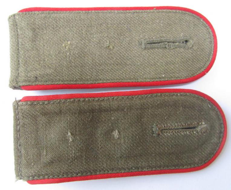 This is a truly very attractive - and rarely encountered and/or almost matching! - pair of (IMO fairly early-war period ie. truly 'DAK'- or: 'Deutsches Afrika Korps'- related-) WH (Heeres) enlisted-mens-type, standard-issued 'tropical'-pattern shoulderstraps, as piped in the neat bright-red (ie. 'hochroter'-) coloured branchcolour, as were intended for - and most certainly worn by! - a: 'Soldat der Artillerie-Truppen' (or simple soldier who served within the army artillery-troops), in overall nice- (albeit moderately used ie. clearly worn-), condition. The neat shoulderstraps - which are as stated above almost matching in execution and/or style - measure approximately 11,2 cms. in length each. Both straps have the typical brownish-green- (ie. tropical-) coloured and/or linnen-based, 'upperdecks' (and field-grey-coloured woolen 'backings'- and/or: 'ribbed-cord'-type tongues as more often) and have the neat and desirable bright-red (ie. 'hochroter'-) coloured branchcolour and/or desirable 'silk-like'-type piping. The pair - which is as stated almost matching but that was constructed from slightly differently styled tropical cloth - comes mounted on its functional tongues and comes as most certainly worn and/or stored as such for decades. The pair was recently found at a private household and was never before in a collection: it had IMO once two pairs of pips attached (which is naturally incorrect for this EM-rank). The neat set was always together and was most certainly worn as such. The set is just a tiny bit dirty ie. stained and shows the clear evidence of having been moderately used and/or worn (it has minimally been faded due to obvious sunlight and does show some minimal rust-staining). It should be noted that all (genuine!) tropical- ie. 'DAK'-related- shoulderstraps are very hard to encounter and can easily be graded 'very rare': most of the pairs offered today are regrettably copies. I am aware of the fact that they are highly priced something that is IMO according to their unmistaken rarity and/or desirability!