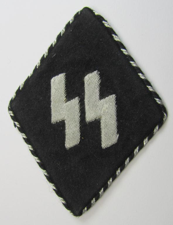 This is a really stunning - and truly rarely encountered! - so-called: 'Allgemeine-SS' sleeve-diamond (ie.: 'Ärmelraute), as was worn by the members of the 'foreign', political- and/or black-uniformed 'Allgemeine' SS-units in both Norway, Belgium and the Netherlands and that comes in a very nice (ie. virtually mint-/unissued- and/or never tunic-attached), condition. The piece which was never worn nor issued (and that does not show any major oxidation nor damage or alike) is executed in the neat black-coloured- and/or smooth- (ie. 'moleskin'-) type wool and shows the hand-embroidered SS-runes as to be expected: the shown craftmanship on the hand-embroidery is really stunning and/or pronounced. The piece - which is neatly 'backed' with the brownish-coloured 'buckram'-based material is moreover neatly 'piped' with twisted, black-/silverish-coloured braid (as can be seen on the pictures). It comes with it originally attached-, paper-based 'RzM'-etiket (see pictures'). One and other proves that it deals with an 'official'- and/or German-produced specimen that was worn by the 'foreign' ie. political and/or black-uniformed 'Allgemeine SS' formations in both Norway, Belgium and the Netherlands. Simply a fantastic and truly rarely encountered piece of SS-cloth-insignia that simply cannot be upgraded!