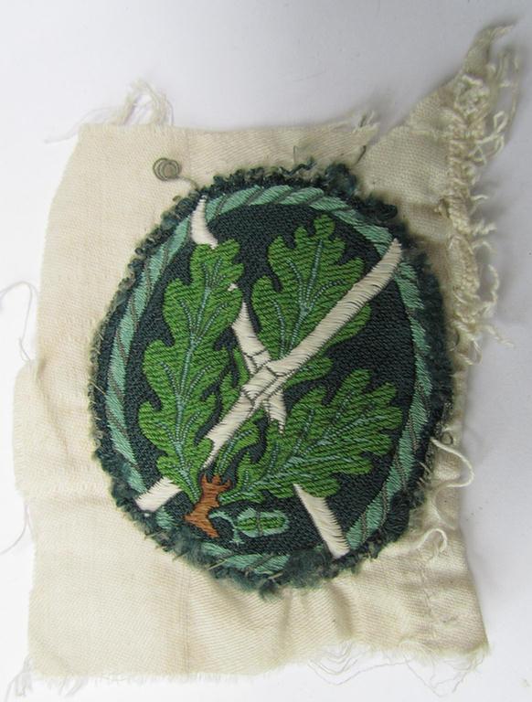 I recently uncovered a superb (ie. nicely period-folded- and/or confectioned-) example of a WH (Heeres) 'Ski-Jäger'-armbadge, being an attractive and/or clearly tunic-removed example as executed in the 'BeVo'-weave-pattern and that comes mounted on its (cut-out!) piece of white-coloured-, linnen-based tunic-cloth. The piece is neatly executed in the so-called: 'BeVo'-weave pattern and does show some age, wear and/or minimal staining. These decorative (arm-)badges were worn on the right upper-sleeve by the troops that were attached to the various 'Ski-Jäger' (ie. rifle-) regiments (being some sort of mid-war-period-, mountain-troop-related, infantry-units). As probably known are these desirable 'Heeres' insignia-pieces heavingly copied and they exist even on a tropical- and/or even white-coloured background: these latter are pure fantasy-pieces and I deem only the model as offered here as the one that was truly issued and/or used. Naturally, will I provide a 100% life-time garuantee on the originality of this piece. I deem that I have priced this example according to its obvious rarity and/or desirability. Simply a great occasion to acquire a nicely folded- and/or confectioned example of a genuine WH (Heeres) 'Ski-Jäger'-armbadge!