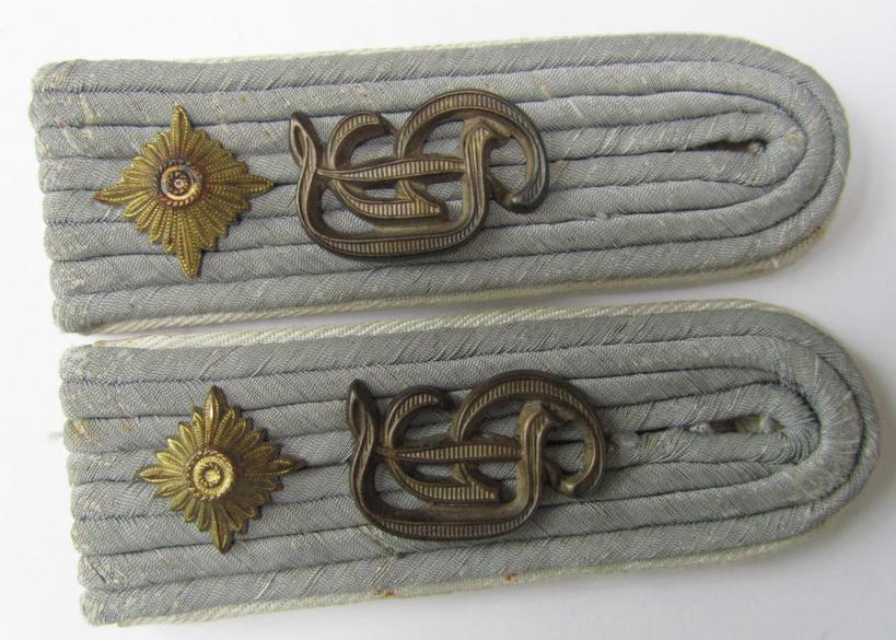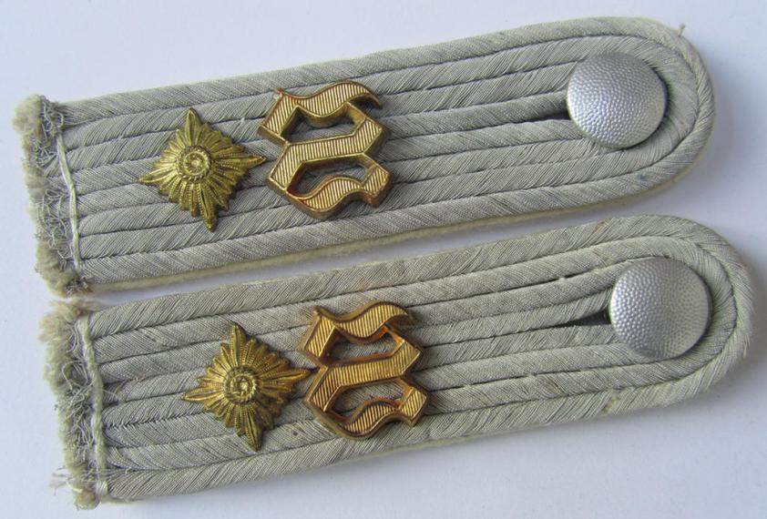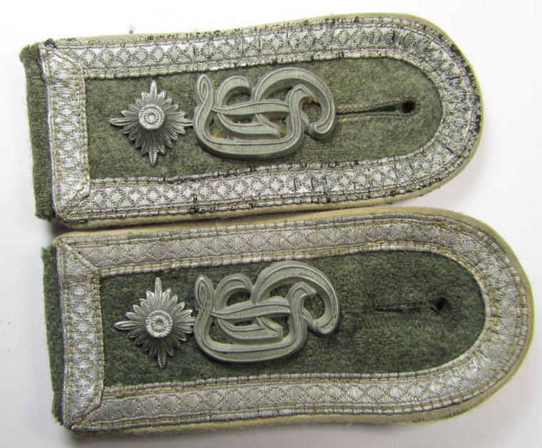This is a very attractive - and fully matching and rarely encountered! - pair of WH (Heeres) neatly 'cyphered', officers'-type shoulderboards as piped in the white- ('weisser'-) coloured branchcolour, as was intended for usage by an: 'Oberleutnant u. Mitglied des Wachbatallions Berlin' (or: lieutnant first-class who served within the famous guard-batallion based in the town Berlin) and that comes in an overall very nice- (albeit IMO minimally used ie. worn-), condition. The boards - which measure approximately 11,5 cms. in length each and that have somewhat 'sub-dued'-, silver-coloured 'upperdecks' - are IMO only moderately used and shows some minor wear, age and/or minimal staining. The boards come without tongue and were with certainty worn as a pair of 'sew-in'-type (as can be seen on the pictures). The boards show the neat (Gothic-styled-, regular-sized-, golden-toned and/or: 'Buntmetall'-based-) so-called: 'W'-'cyphers' and one pip each attached, denoting the officers'-rank of: 'Oberleutnant'. All four devices are IMO executed in 'Buntmetall'-based-metal and show some minimal age ie. tarnish: they have, however, maintained a neat and somewhat 'frosted' appearance. The pair came with a pair of silver-toned, 'screw-on'-buttons ('Schraubknöpfe'). Simply a very attractive, 'cyphered', 'Infanterie'-related officers'-type shoulderboard-pair that once belonged to an: 'Oberleutnant u. Mitglied des Wachbatallions Berlin': I deem that I have priced this superb pair according to its comparitive rarity and/or desirability!