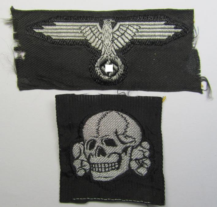 The very attractive Waffen-SS officers'-pattern insignia-set on offer here so-called: flat-wire 'BeVo'-weave pattern (and is executed in shiny, silver-coloured thread on a black-coloured- and/or: linnen-based background). As such, it can naturally easily be mounted on any Waffen-SS officers'-pattern side-cap (ie. 'Offiziersschiffchen') (or even 'M43'-officers'-type-cap ie. 'Einheitsfeldmütze'). The skull - which is of the desirable pattern showing the golden-yellow-toned 'fortification'-threads on its back - comes in virtually mint- ie. unissued condition and comes 'as straigthly cut-off the role'. The cap-eagle comes in an equally non-confectioned- ie. never cap-attached condition and also comes as 'straightly cut of the role': the eagle has, however, been removed from an album or scrap-book as the tiny glue- and/or carton-remains on the back suggest (as can be seen on the pictures). The piece shows some tiny holes on its backing and comes a tiny bit stained (simply caused by years of storage only). Both rare insignia-pieces in the set were of course never cap-attached. It should be noted that these original Waffen-SS-related officers'-pattern head-gear-sets as executed in flat-wire 'BeVo'-weave pattern are almost impossible to find and can nowadays easily be graded 'very rare'. I have seen these sets sell for much more than my asking-price!