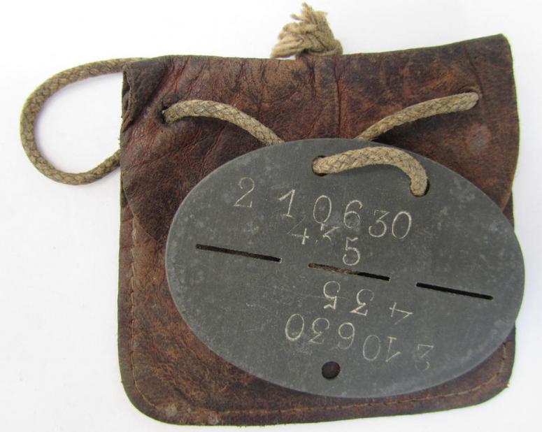 This is an attractive - and actually rarely encountered! - example of a greyish-silver-coloured- and/or zinc-based, WH (Luftwaffe-) ie. 'Fallschirmjäger'-related ID-disc, bearing the clearly stamped- and/or: 'coded' unit-designation: '210630' (and as such belonging to a soldier who served within the: '13./Fallsch.-Jäger Ers.u.Ausb. Rgt. 3') that comes stored in its genuine-leather-based pouch as worn and/or stored for decades. The disc comes in an overall very nice (albeit clearly used ie. worn-), condition (and is executed in an attractive letter-type!) and shows the clear evidence of having been used ie. worn (see pictures). The disc is void of a bearers'-blood-group-type (something that was more often seen on these 'coded' ID-discs but came mounted on the remains of its period cord). The disc was never cleaned nor polished (it is still a tiny bit stained and/or dirty). The pouch is also clearly worn (and is somewhat stained): it is, however, still fully functional. The set originates from a private household in Germany where it was recently uncovered. Simply a very attractive and honest 'coded' WH (Luftwaffe-) ie. 'Fallschirmjäger'-related ID-disc that might merit some further investigative work and that is IMO accordingly priced!