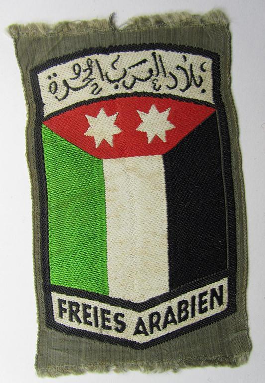 This is a truly superb - and extremely rarely encountered! - example of a colourfull, 'BeVo'-type armshield entitled: 'Freies Arabien', as was intended for usage by the volunteers within the 'Deutsche Wehrmacht' (ie. within the: 'Arabisches Legion'), in overall very nice (ie. virtually mint/unissued-) condition. The shield is in a mint, unissued condition but does show some minimal age and/or staining and minimal fraying on both bottom and/or top (simply caused by storage and having been handled over the years). These - original - 'official' German produced arm-shields as executed in the 'BeVo'-type weave (ie. German manufacture by the company of 'BeVo'!) are considered extremely rare: only a handfull of these insignia are known to exist to date. The piece is void of any damage and comes as straightly 'cut-of the role'. The piece shows the Arabian national colours with above the text: 'Freies Arabien' woven in arabic script: on the bottom it shows the wording: 'Freies Arabien' in German language. These armshields rank amongst the rarest ones out of the colourfull series and are almost never offered for sale. I have seen these sell for much more than my asking-price and deem therefore that this superb example is accordingly priced: simply a great occasion to acquire one of the most rarely seen German volunteer-shields!