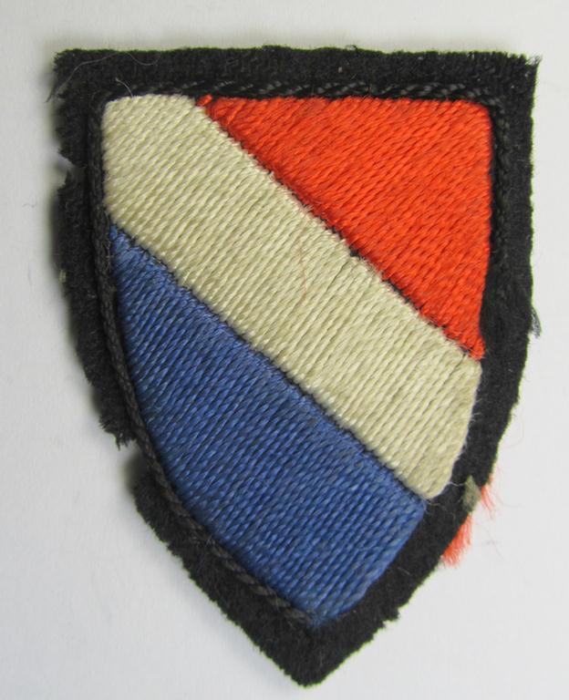 This is an attractive - and truly rarely encountered! - example of a (presumably) Dutch-produced, example of an early-pattern- ('pointed styled') Waffen-SS 'volunteer' arm-shield (ie. 'Ärmelschild'), as was intended for usage by the Waffen-SS soldiers of the: 'Frw. Legion ''Niederlande'' (and that was worn throughout the war) depicting the: 'orange/blue/white'-colours (ie. Dutch national flag) and that comes in a very nice- and/or clearly tunic-removed, condition. The shield is (IMO) of the early (1941/1942-period-) type and was as stated, clearly issued and worn (it also shows two tiny moth-damaged areas in the black-coloured rim as can be seen on the pictures). I have various, similar examples in my own, personal collection. It should be noted that these early-pattern- ('pointed styled') can be easily considered 'very rare': this is only the third such desirable example I ever had on offer. Simply a nice occasion to acquire a 100% guaranteed original- and truly used Dutch-related, early-pattern volunteer-armshield!