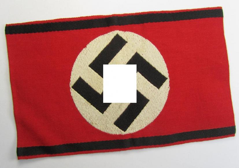 This is a very attractive - and truly rarely encountered! - example of an IMO early-war- (ie. 'pre-war'-) period, 'Allgemeine-SS'-related armband (as was used on the various black-coloured uniforms) being of the neat - and not that often encountered! - 'partly-woven'-type in a technique similar to the 'BeVo'-weave pattern and that comes in an overall very nice- (IMO hardly used ie. worn-), condition. These linnen-based armbands were 'standard-issue' for usage by the various 'Allgemeine-SS'-members and/or officials and were worn on the left upper-arm. This example - having a total size of 36 cms. and is 11,5 cms. wide as more often - is constructed from bright-red-coloured- (and somewhat course-like) linnen and shows a neatly (inter-woven-) so-called: 'swastika'-roudel and two horizontally mounted, black-coloured 'stripes' (all being executed in a technique similar to the 'BeVo'-weave pattern). The black-coloured swastika is woven onto a white coloured- and linnen-based roundel (see pictures). This example is void of an interwoven maker- and/or patent-pending- marking and is not ink-stamped (something that is more often encountered). The piece is very nicely made and shows only moderate age, staining and/or minimal wear (as can be seen on the pictures). Simply a very nice and desirable 'variant'-pattern, 'Allgemeine-SS'-related item that is IMO accordingly priced!