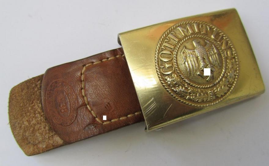 This is a very difficult and scarce buckle to encounter: a truly very nicely preserved example of a WH (Kriegsmarine) bright-golden-toned- (ie. 'feuervergoldetes'), aluminium-based-, belt-buckle that comes mounted on its original leather-based 'tab', as was produced by the: 'R.S.& S.' (= 'Richard Sieper u. Söhne') company in 1938 and that comes in a very nice- (albeit minimally used- and/or worn- and regrettably incomplete- ie. slightly damaged-), condition. The company: 'R.S.& S. was IMO the only producer of this type of buckle. The buckle comes in a slightly used condition - showing some minimal wear and scratching as usually encountered - but still has truly most of its golden finish remaining (which is rarely the case!) and is in great shape overall: I would grade the piece as truly 'very nice'. As always, does the buckle bears the company logo: 'R.S. & S'. (as usual visible under the catch) and is just a bit dirty and was never cleaned nor polished. The (natural-coloured-) leather tab is also in a nice and/or souple condition: it bears the oval 'R.S.& S.'-production-stamp and shows a clear date: '1938' and is additionally stamped with a so-called: 'Marine-Abnahme'-stamp (being a small eagle-device with swastika as can be seen on the pictures). The tab shows some minimal staining but is fully souple and/or functional. Regrettably, is one of the (aluminium) 'belt-holder pins' missing ie. broken-off (as can be seen on the pictures). The buckle is expensive but is IMO still fully worth its money: it will be hard to find a better example for a better price!