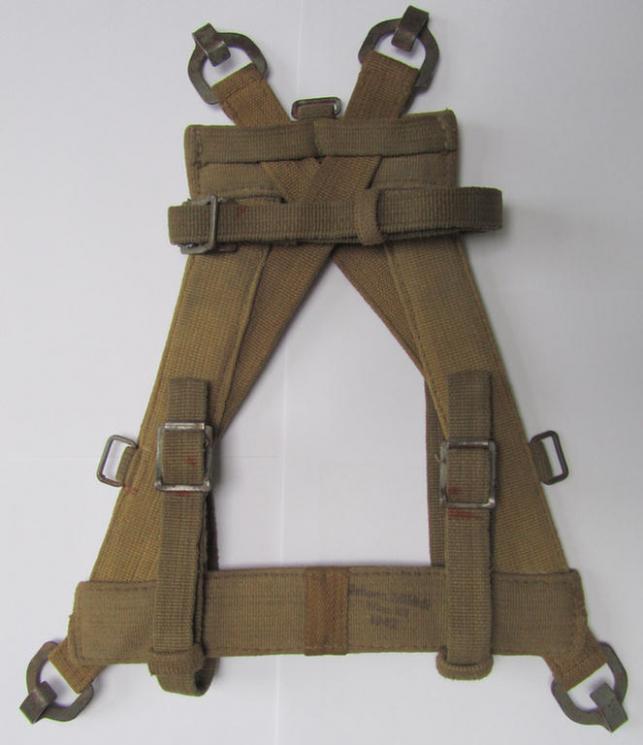 This is a truly fantastic - albeit moderately used but nevertheless scarcely seen - early- (ie. mid-war-) period, specific 'tropical issued', WH 'A-Frame' (ie. 'Gefechts- or 'Sturmgepäck') that comes complete with all its cloth-based lashes, metal-loops and tan-coloured linnen-based straps present and in place. The frame - which was recently found at a private household - comes complete with its specific horizontally-mounted strap (as can be seen on the pictures). Of interest is, moreover, the fact that the frame is of the specific 'tropical'-version which saw usage within the 'Afrikakorps' (but saw usage throughout the war). The 'pack' is naturally fully functional and complete and does show a clearly visible (albeit hard to decyher albeit) readable date- ('1942') and producers'-stamp (as can be seen on the pictures). The 'pack' is only moderately used and does show some minimal (rust)staining but is totally void of any real damage. Both its metal rivets are original to the frame and are not re-mounted-, re-rivited or alike). This example was surely issued and/or used, and can IMO be graded as a truly DAK- (ie. 'Afrikakorps'-) related item. All metal parts still retain (most of) their greyish (anodized) finish but do show some minimal (rust)staining. The piece comes as stated above complete with its specific horizontally-mounted strap which was intended to hold the mess-tin. Simply a truly attractive and nowadays scarcely seen piece of 'tropical'-issued WH-equipment!