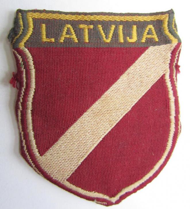 This is a truly rarely encountered example of a so-called 'semi-BeVo'-pattern ie. 'Waffen-SS-type' armshield entitled: 'Latvia', as was intended for usage by the members of the so-called: 'Latvian Legion' and later the: '15. Waffen-Grenadier-Division der SS' (or: 'Lettische nr.1') that comes in an overall very nice- (albeit moderately used and clearly tunic-removed-), condition. The shield comes as stated above in a clearly used and/or tunic-removed condition (it is however not 'trimmed' but just folded into shape) and rates as one of the more difficult SS-type shields to encounter. The used 'weave' technique is very nice and similar to the German 'BeVo'-style technique. The shield shows some minimal wear and/or age and is minimally stained simply caused by moderated usage and/or wear. Simply a very nice and most certainly rarely encountered foreign-volunteer-related item: only the second such rare item I ever had on offer!