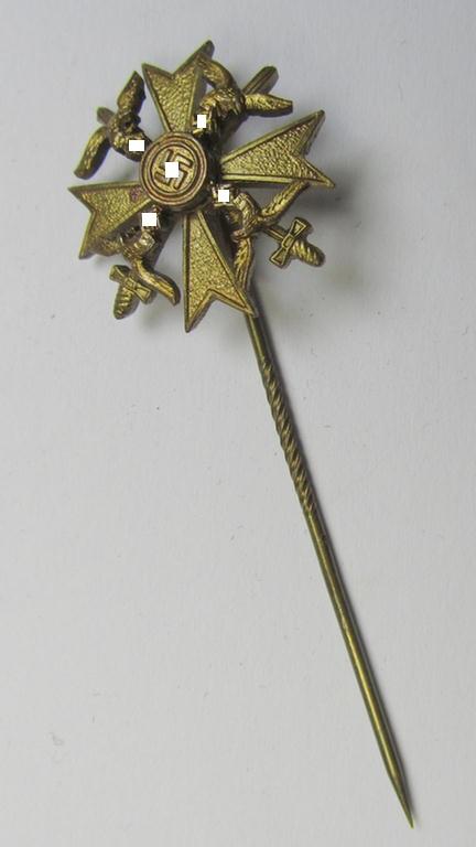 This is a truly attractive - and actually very rarely encountered! - 20-mm.-sized miniature of a: 'Spanienkreuz mit Schwerten in Gold' (or: Spanish cross in gold with swords) being a very attractive non-maker-marked- and/or very detailed and pronounced example that comes in a wonderfull condition. The neat and very detailed 'Halbminiatur' - which comes mounted on its functional (copper-coloured- and long-sized-) pin is a superb golden-coloured- and/or pronounced (and 'Buntmetall'-based-) specimen that is constructed in multi-pieces (just as its regular-sized counterparts). The miniature award truly retains all of its golden-toned (ie. minimally darkened-) finish and is IMO only minimally worn (but was certainly never cleaned nor polished). The attractive piece originates from a private household in Germany and was never in collectors'-hands. Simply a superb example of this rarely encountered and/or very decorative miniature-award which is IMO accordingly priced!