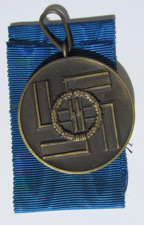 The attractive (and/or non-maker-marked-) medal is a very attractive and/or truly detailed piece that retains almost all of its fairly 'frosted'-styled, darkened- and bronze-toned finish as issued. The medal - which is as always executed in so-called: 'Buntmetall' - comes together with its (as always fairly wide-sized-) cornflower-blue-coloured ribbon as to be expected. This ribbon measures approximately 17 cms. and does show some minimal staining: I deem that it was once mounted onto the ribbon but came in a nicely folded condition. The medal comes mounted on its typically shaped ring (ie. 'Tropfenöse') and has most certainly never been cleaned - it shows some minimal tarnish - and has an immaculate (ie. fully undamaged-) bronze-coloured age-patina (see pictures). Simply a very attractive example of the: 'SS-Dienstauszeichnung der 3. Stufe' that is almost impossible to be upgraded!