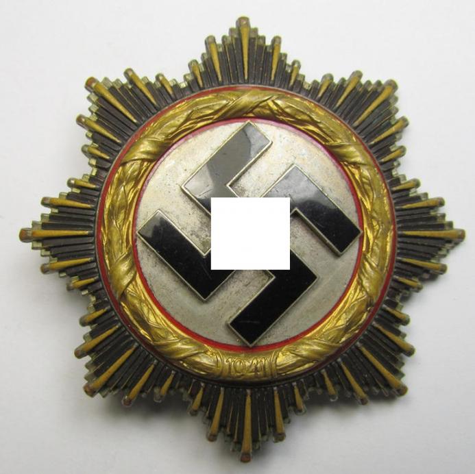 This is a truly very attractive - albeit clearly issued and/or moderately used - example of a neatly maker- (ie. '20'-marked-) example of WH (Heeres, Waffen-SS, Luftwaffe etc.) 'Deutsches Kreuz im Gold' (or DKiG ie. German Cross in gold) being a regular (ie. IMO 'heavy'-weight) piece that was with certainty produced by the: 'C.F. Zimmermann'-company as based in the town of Pforzheim and that comes in an overall very nice- (albeit used- ie. moderately worn-), condition. The piece has a (fully preserved and totally undamaged!) enamelled surface (ie. swastika-area) that just shows some minimal wear and/or minimal scratches (something that can be seen on the pictures). The piece shows some moderate age ie. wear but is totally void of any (real) damage. It shows a bright-golden-toned (ie. metal-based) wreath as to be expected. The award shows an attractive silver-coloured age-patina (it has not been cleaned and is still a bit dirty ie. stained) and retains all its four (fully unaltered and hollow-styled) rivets in place. The award shows a clearly present maker-designation '20' in place (present on the inside of the flute-shaped pin) and comes as expected on its fully functional (and equally unaltered!) catch- ie. pin-set-up in place. Simply a very attractive - and naturally 100% genuine! - example of a high-class award - only second in grade to a Knights Cross or 'Ritterkreuz des Eisernen Kreuzes'! - that IMO is accordingly priced. Simply a stunning regular-weight 'Zimmermann'-example that is actually hard to be upgraded!