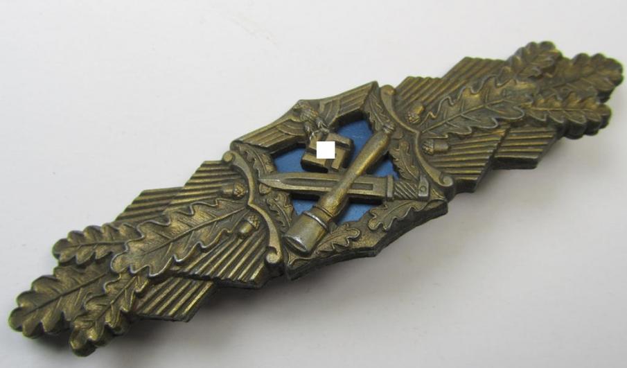This is a very attractive - and actually scarcely encountered! - example of a so-called: 'Nahkampfspange in Bronze' (or bronze-class close-combat clasp ie. CCC), being a nicely maker- (ie. 'A.G.M.u.K.'-) marked- and/or minimally converse-shaped specimen that was produced by the: 'Hersteller' (ie. maker): 'A.G.M.u.K.' (or: 'Arbeitsgemeinschaft für Metall- u. Kunststoff') and that comes in an overall very nice (and IMO only minilally used ie. worn-), condition. The piece - which has a very detailed and/or pronounced appearance as to be expected - is as stated above - a neatly maker-marked specimen bearing the makers'-signification: 'A.G.M.u.K.', denoting that it deals with a piece as was produced by the: 'Arbeitsgemeinschaft für Metall- u. Kunststoff'-company based in the town of Gablonz. The 'Spange' is as stated minimally converse-shaped and shows a flute-shaped - and/or copper-toned - pin (and/or catch-/catch-set-up), both which are of course still present and/or fully functional. The clasp - which is executed in zinc-based metal ie. 'Feinzink' - retains almost all of its original (light-coloured-) brownish-bronze-toned finish and has IMO never been cleaned nor polished. The firmly 'crimped' (bluish-coloured-) metal-based 'back-plate' is naturally also present and in place. The piece was found as such at a private household and was never before in collectors'-hands. Simply a very attractive example of a bronze-class 'Nahkampfspange' that will be very hard to be upgraded: it should be noted that original examples of this neat combat-award are nowadays getting hard to get. An identical example is also described in Thomas Durantes' excellent reference-work entitled: 'The German Close Combat Clasp of World War II' wherein it is given the unique reference-number: '1.1.1 large font CCC - indented crimp backplate'. I deem that I did price this neat example according to its overall superb and/or fully untouched condition!
