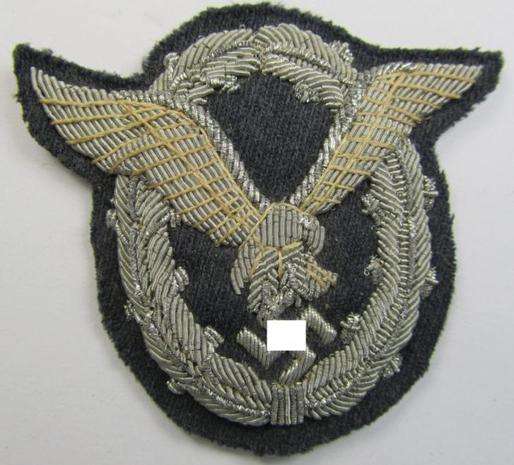 This is a truly very attractive and/or pronounced, hand-embroidered example of an WH (Luftwaffe) so-called: 'Flugzeugführer-Abzeichen' (or: pilots'-badge) that comes in an overall very nice- (albeit moderately used ie. IMO worn- and/or carefully tunic-removed-), condition. The attractive - and most certainly rarely encountered! - piece has simply extraordinary detail and is wonderfully executed in silver-braid: it is a clear example of the great crafmenship employed in the days. The award - which has been executed on fine-structured, LW-officers'-type wool - has a neat and/or slightly tarnished 'age-patina' and is backed with black-coloured linnen (as more often). It originated from a private household in Germany and once belonged to a (regrettably) unidentified pilot. These cloth-based versions were preferred by the NCOs and/or officers 'stationed in the field' for obvious reasons. I should be also noted that these hand-embroidered versions are actually much more rarely encountered than their metal counterparts. Simply a very attractive example of this desirable Luftwaffe-award that is IMO priced according to its wonderful condition: I do not know another such beautiful example for sale!