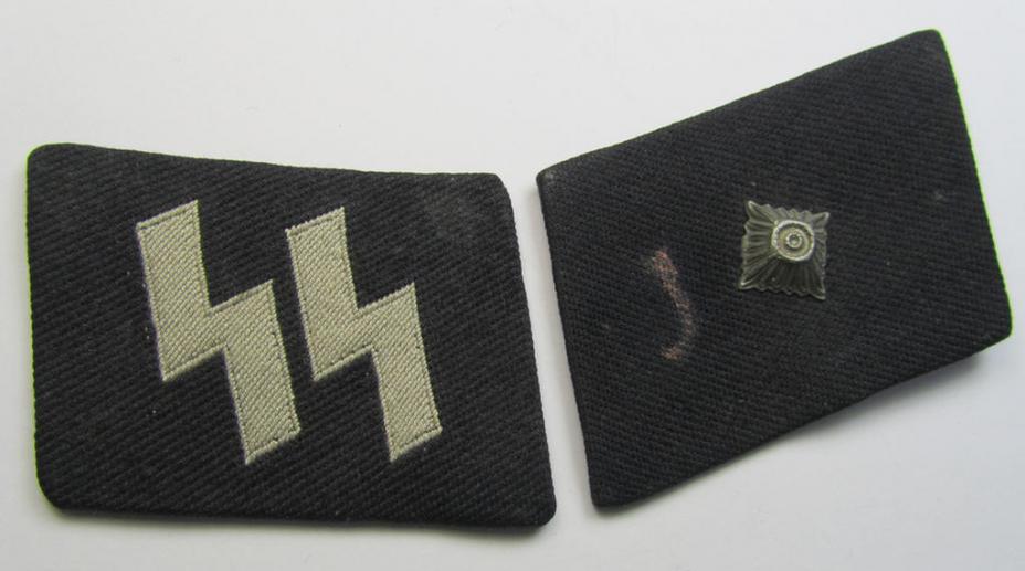 This is a very attractive - and truly rarely encountered! - Waffen-SS, enlisted-mens'- (ie. NCO-) pattern collar-tab set ('Kragenspiegelsatz') comprising of a runic tab and rarely seen rank-tab both examples as executed in so-called: 'BeVo'-weave pattern, that both come in an overall very nice- (ie. IMO issued-, worn- and/or carefully tunic-removed-), condition. It should be noted that the ('BeVo'-woven) black-coloured- and/or linnen-based rank-tabs are x-times more rarely encountered than their runic counterparts and are nowadays almost impossible to encounter. The runes-tab has the white-couloured- and/or: 'Buckram'-based 'backing' whereas the rank-tab shows a (typical) brownish-couloured 'backing' something that is more often observed (as can be seen on the pictures). The rank-tab shows a tiny (pink-coloured) stain (as can be seen on the pictures). I know that this set is highly priced, but it should be noted that in 40 years of collecting, I have only encountered a handfull such (matching) sets. This set was found together as such and I will not separate them and therefore only sell them as a pair. The runic-tab shows a (period-attached-, zinc- ie. Feinzink- based-) pip, denoting that this set was intended to be used by a Waffen-SS-NCO ie. 'SS-Unterscharführer'. Without doubt a truly nice and rarely seen Waffen-SS rank-tab set!