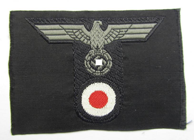 This is a very attractive - and truly rarely seen! - example of a WH (Heeres) so-called: 'T-shaped'- (ie. 'M42-pattern'-) cap-eagle/cocarde (ie. 'Mützentrapez' or: trapezoid-shaped cap-eagle) as was specifically produced for usage on the (impopular) black-coloured, 'M-42'-model 'Panzer'-side-caps (ie. 'Schiffchen') and that comes in an overall very nice (ie. virtually mint- ie. unissued- and/or never cap-attached-), condition. The piece is neatly executed in so-called 'BeVo'-weave-pattern and was never confectioned nor cap-attached: it comes 'as straightly cut-off the role' and simply cannot be upgraded. The patch is executed in bluish-grey-coloured linnen on a typical, black-coloured (and/or also linnen-based-) background (as can be seen on the pictures). As most certainly known were these neat cap-trapezoids specifically produced for usage on the impopular 'M-42'-model side-caps (ie. 'Schiffchen') but were also used on the much more popular 'M43'-model 'Panzer'-caps (ie. 'Einheitsfeldmützen für Panzertruppen'). It should be noted that these 'M-42'-model 'Panzer'-side-cap-eagles rank amongst the most difficult to find specimen of the extensive series!