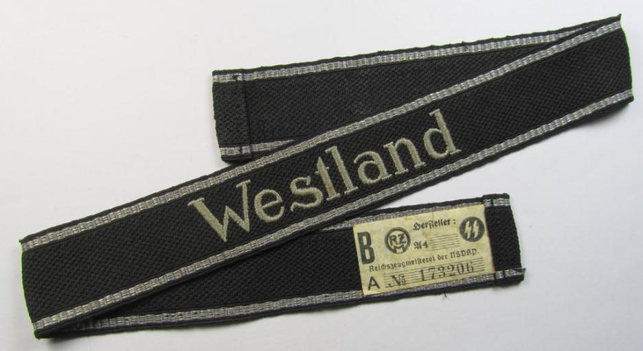 This is a truly very attractive - and naturally 100% original and fairly rarely encountered! - early- (ie. mid-) war-pattern-, EM-type-, 'RzM'-pattern, Waffen-SS cuff-title (ie. 'Ärmelstreifen') depicting the machine-woven Latin-script text in silver-greyish-coloured linnen and still retaining its period-attached 'RzM'-etiket as was intended for a member ie. European volunteer who served within the: 'SS-Regiment "Westland" (being a regiment within the '5. SS-Panzergrenadier-Division "Wiking") and that comes in an overall very nice (ie. virtually mint- ie. unissued- and/or never worn-), condition. The truly full-length cuff-title (approx. 48/49 cms. sized in length) has the typical reverse- and 7 silver-coloured 'strands' and shows all details of an original, period-produced specimen as to be expected. It shows the 'off-factory'-stitched ends. This cuff-title was with certainty never worn nor tunic-attached and can easily be graded 'virtually mint- ie. unissued'. It should be noted that this specific regimental cuff-title is one of the more rarely seen examples of the extensive SS-cuff-titles-series: it was (amongst others) extensively worn by the Dutch Waffen-SS volunteers. Simply a great opportunity to acquire an attractive and truly rarely encountered Waffen-SS 'RzM'-type cuff-title for a competitive price: I have seen these minty "Westland"-cuff-titles sell for much more than my asking-price!