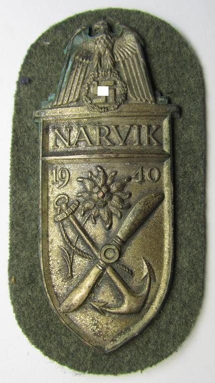 This is a truly very attractive - and actually scarcely encountered! - WH (Heeres) 'Narvik'-campaign-shield, being a very detailed example as was executed in greyish-silver-toned (non-magnetic) metal (ie. 'Buntmetall') and that comes in an issued- (albeit IMO never worn- nor tunic-attached-), condition. The (naturally non-magnetic) shield comes complete with its original (presumably zinc-based-) 'back-plate' and retains all its four period-mounted prongs (of which all four of them are present and functional). Its period-backing (which was presumably constructed of a piece of field-grey-coloured 'Heeres'-type wool) is, however, missing (as can be seen on the pictures). The shield shows some normal aging and/or tarnish caused by years of storage but has nevertheless retained extraordinary detail. Most of its silver-toned finish has been nicely preserved as is not always the case (as can be seen on the pictures). The shield was with certainty never cleaned nor polished and comes as recently found at a private German household. Simply a very attractive and naturally 100% garuanteed original and IMO early-war-period, 'Heeres' 'Narvik'-campaign-shield that is IMO accordingly priced!