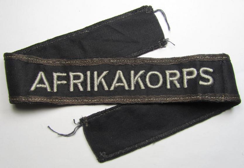 This is a truly very attractive - and IMO issued and/or once tunic-attached - example of a WH (Heeres) cuff-title (ie. 'Ärmelstreifen') entitled: 'Afrikakorps', being a truly rarely seen example as executed in greyish-coloured lettering on a black-coloured linnen background (as was IMO exclusively produced for usage by the 'Panzer-Truppen') and that comes in an overall very nice- and/or non-shortened- ie. full-length, condition). The piece is as stated above never shortened and measures approximately 44 cms. in length. As usual, are both ends 'unfinished' and do show some normal ie. minimal fraying as to be expected (as can be seen on the pictures). This example was stored as such for years by the veteran to whom it was issued. The piece was never cleaned and shows some mininal age and/or staining simply caused by moderate wear and/or decades of storage: it was never in a collection before and came as such from a private household. These black-coloured 'Afrikakorps'-cuff-titles were IMO exclusively produced for usage by the 'Panzer-Truppen' (and were for example worn on the black-coloured 'Panzer', 'wrap-around'-tunics). Simply a superb and truly very rarely seen example of this desirable 'Afrikakorps'-cuff-title!