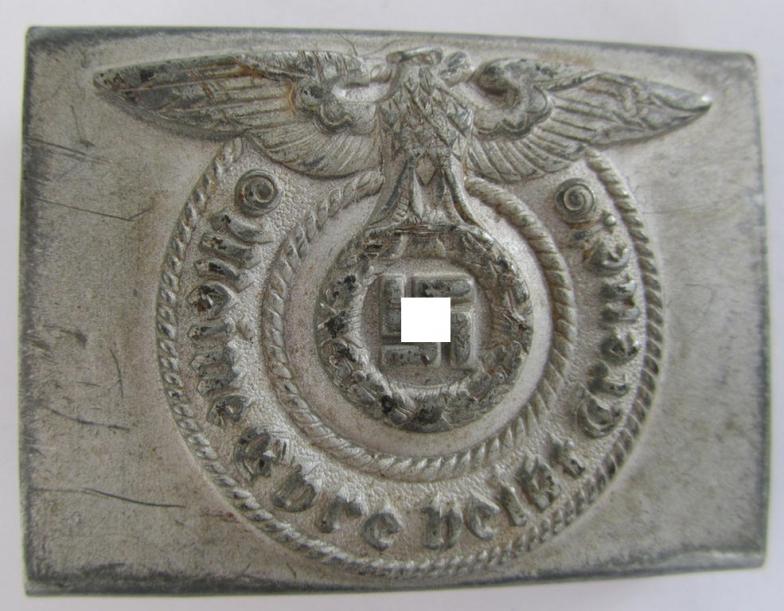 The truly very attractive (and naturally steel-based-) belt-buckle comes in a minimally used ie. worn condition but still retains most of its original-applied silverish-coloured- and/or sprayed finish: the piece was simply moderately used and/or worn (as can be seen on the pictures). The piece shows some minimal dirt and/or evident staining (it has however most certainly not been polished nor cleaned). The buckle has still a very detailed appearance and retains a very nice and/or decent, somewhat tarnished age-patina (see pictures). The buckle a is typical, maker- (ie. 'JFS'- ie. 'Josef Feix u. Söhne'-) marked example that shows the impressed 'JFS'-stamp (as can be seen on the pictures). As certainly known are these original, steel-based SS buckles nowadays getting really hard to find, especially if one prefers such a neat and/or only minimally used 'JFS'-example as the one on offer!