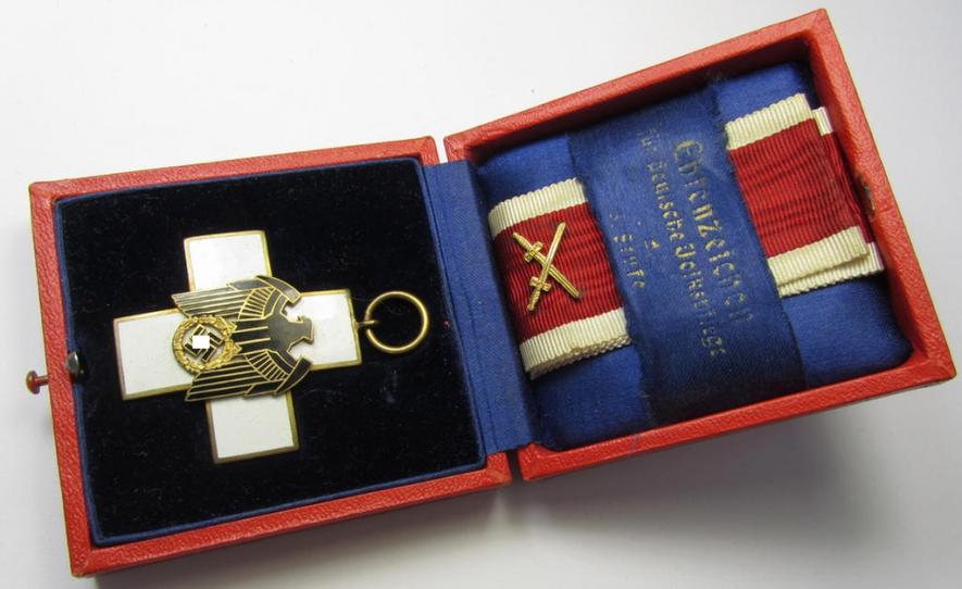 The very attractive 'Ehrenzeichen für deutsche Volkspflege 3. Stufe' (or: civil-service honorary medal of the third class) is IMO executed in golden-coloured, 'Buntmetall'-based metal and is a very detailed and/or pronounced example that retains a fully preserved (and undamaged!) enamelled surface (as can be seen on the pictures). It came together with its original ribbon (ie. 'Bandabschnitt') and/or: medal-bar (ie. 'Feld- o. Bandspange') as issued and/or stored for decades. The award has a truly nice, somewhat 'shiny', age-patina and is also a tiny bit dirty but was IMO never cleaned nor polished (see pictures). The medal came together with its neatly pre-folded- and/or full-length (ie. 25 cms.-sized-) piece of (truly bright-red-coloured- ie. not-faded-) ribbon and accompanying 'Feld- o. Bandspange' (ie. single-pieced ribbon-bar) as issued and/or recently found. The medal was with certainty issued as such and was IMO hardly used nor even mounted: it was stored as such for decades. The set came stored in its (typical) bright-red-coloured- and semi-leather-based etui (that comes in an equally nicely preserved condition). I deem that this is a high-quality produced example as was produced by the famous maker: 'Gebr. Godet' based in the town of Berlin (something that can naturally be elaborated by the presence of the impressed makers'-stamp on the back of the etui (as can be seen on the pictures). Simply an attractive (and complete!) example of an attractive: 'Ehrenzeichen für deutsche Volkspflege 3. Stufe' that will be hard to be upgraded and that is accordingly priced!
