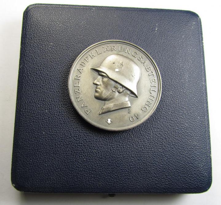 These very attractive commemorative table-medals - as executed in (light-weight-) metal (ie. so-called: 'Kriegsmetall') and having an approximate diameter of 5 cms. - were designed by the famous TR-artist Dr. Richard Klein and were disseminated ie. awarded on a very limited scale. The medals were constructed (and dissiminated) by a private person (ie. being the WH (Heeres) officer ie. 'Oberstleutnant' by the name of Rolf Grams) and were as such non-official awards. These medals existed in five different versions and were only produced by the Deschler-company in München (as is the example on offer here). All five versions show the detailed face of a simple soldier wearing a steel-helmet, surrounded by a text and all five versions differed on their respective backs: they were awarded on a very limited scale (some sources speak of only 200 awards per medal only!). The medal on offer here was specifically (and merely!) intended for the staff of the: 'Panzer-Auklärungs-Abteilung 40' (being a part of the: '14. Panzer-Division') and shows a divisional-emblem flanked by the dates: '15.8.40 - 15.4.42'. It is also neatly maker-marked: 'Deschler-München' and bears the initials of the designer 'RK' (as can be seen on the pictures). The medal on offer was never cleaned nor polished and retains a minimally tarnished 'age-patina': it retains truly pronounced detail. The medal was recently found at a private household in Germany and was never before part of any collection: it came as stored for decades and was found stored in its (genuine!) darker-blue coloured (and semi-leather-based-) etui. This etui - which is approximately sized: 11 x 11 cms. sized - also bears the: 'Deschler & Sohn - München'-makers'-designation and comes in an equally wonderfull condition: it retains a fully preserved, light-yellow- (ie. white-coloured-) inlay (see pictures). Regrettably, are most of these so-called: 'Nichttragbare Erinnerungsmedaillen des Heeres' which are offered on todays' market copies: this is naturally a 100% genuine, period-piece for which I naturally provide a life-long garuantee (as always). I dare to suggest that these genuine examples are truly of extreme rarity and are almost never offered for sale: I deem that this extremely attractive award is therefore with certainty accordingly priced!